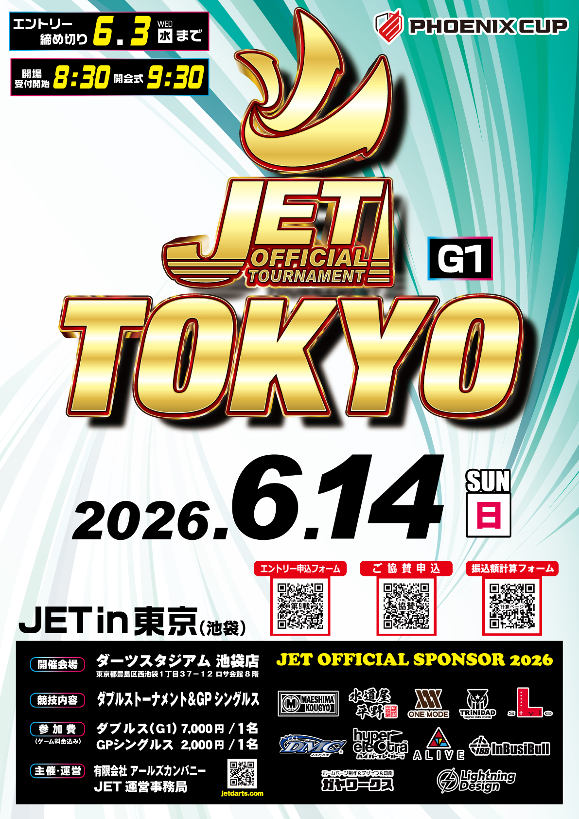 大会日程 大会結果 ランキング JETプレイヤー すべてのフォトギャラリー 詳細を見る 詳細を見る 詳細を見る 詳細を見る 2026 RANKING 2026年3月15日JET in 静岡 終了時点 男子総合ランキング 男子総合ランキングはこちら 女子総合ランキング 女子総合ランキングはこちら RESULTJET in 群馬 男子GPシングル 優勝 タカハシ リョウ (100 pt) (zero R) 準優勝 ミナミ ヒデナミ (82 pt) (InBusiBull) 3位タイ マガミ リョウイチ (67 pt) (zero R) 3位タイ キョウヤ トモユキ (67 pt) (スポーツダーツフィールド・ガヤ) 女子GPシングル 優勝 カワシマ ジュン (100 pt) (Bang) 準優勝 ツルマキ ナナカ (82 pt) (Darts Dining ensembull) 3位タイ ナカムラ ユキコ (67 pt) (Dama De Noche) 3位タイ カマタ アイ (67 pt) (meat dining TABUKIYA) DIVISION-1 優勝 ヨシザワ タケシ カワシマ ジュン (20 pt) (Bang) 準優勝 シミズ ヨシヒロ ゴトウ ユウヤ (16 pt) (Bang) 3位タイ ミナミ ヒデナミ イマキタ ユウゴ (12 pt) (InBusiBull) 3位タイ タキザワ コウタ ヨコタ リョウ (12 pt) (meat dining TABUKIYA) DIVISION-2 優勝 タカハシ リョウ クメタ ヒサト (20 pt) (zero R) 準優勝 マツバラ コウジ ケンモチ エイジ (16 pt) (SoleReef) 3位タイ クスノキ マリア サイス ショウタ (12 pt) (AZ BOX) 3位タイ ババ コウイチ シマダ ユウイチロウ (12 pt) (zero R) DIVISION-3 優勝 タカハシ ヒロト タドコロ ヒロキ (20 pt) (AZ BOX) 準優勝 カクダ ミノル ヨコイ タケシ (16 pt) (SoleReef) 3位タイ クノ トモヤ タカヤナギ ケイスケ (12 pt) (Darts Dining ensembull) 3位タイ ヨシダ カズヒロ サワベ モモカ (12 pt) (InBusiBull) DIVISION-4 優勝 ナカムラ ユキコ ナカムラ ヨウスケ (20 pt) (Dama De Noche) 準優勝 イワサキ ハルキ ナカムラ シュンスケ (16 pt) (Darts Dining ensembull) 3位タイ ハギワラ ハヅキ ナゴシ ユウヤ (12 pt) (Darts &Bar One Eighty) 3位タイ サノ リョウタ タカハシ レン (12 pt) (Dama De Noche) DIVISION-5 優勝 ササキ ナオヤ イワタ チヒロ (20 pt) (zero R) 準優勝 アゼミ ヒロキ ツルマキ ナナカ (16 pt) (Darts Dining ensembull) 3位タイ ノガミ タケヤ セキヅカ ノリアキ (12 pt) (zero R) 3位タイ ワタナベ ケイト スズキ サヤカ (12 pt) (CLOUD9) DIVISION-6 優勝 ナカムラ タカト イノウエ テッペイ (20 pt) (Darts Dining ensembull) 準優勝 イトウ ノリキ イトウ ナオコ (16 pt) (NiigataDartsClub) 3位タイ フルヤ ナリヒト ハセガワ タカヒサ (12 pt) (Rest and Bar GHOST) 3位タイ ミヤザワ コウジ クママル ハヤト (12 pt) (Darts &Bar One Eighty) 2026 JET OFFICIAL SPONSORS Facebook JET DARTS Tournament Instagram 2026年 4月 5日(日) 【 JET in 群馬 】G1 会場:ビエント⾼崎(ビッグキューブ)に 2026年 4月 5日(日) 【 JET in 群馬 】G1 会場:ビエント⾼崎(ビッグキューブ)に 2026年 4月 19日(日) 【 JET in 新潟 】G1 会場:燕三条地場産センターにて開催! 2026年 4月 19日(日) 【 JET in 新潟 】G1 会場:燕三条地場産センターにて開催! 2026年 4月 5日(日) 【 JET in 群馬 】G1 会場:ビエント⾼崎(ビッグキューブ)に 2026年 4月 5日(日) 【 JET in 群馬 】G1 会場:ビエント⾼崎(ビッグキューブ)に 2026年 4月 5日(日) 【 JET in 群馬 】G1 ~ご確認をお願いします~ お名前、性別 2026年 4月 5日(日) 【 JET in 群馬 】G1 ~エントリーリスト更新しました~ お名 2026年 4月 5日(日) 【 JET in 群馬 】G1 エントリー締切りが迫っております! ま 公式Instagramをフォロー ホーム お知らせNEW JETについて 大会規約 大会日程 大会結果 ランキング JETプレイヤー ギャラリー お問い合わせ