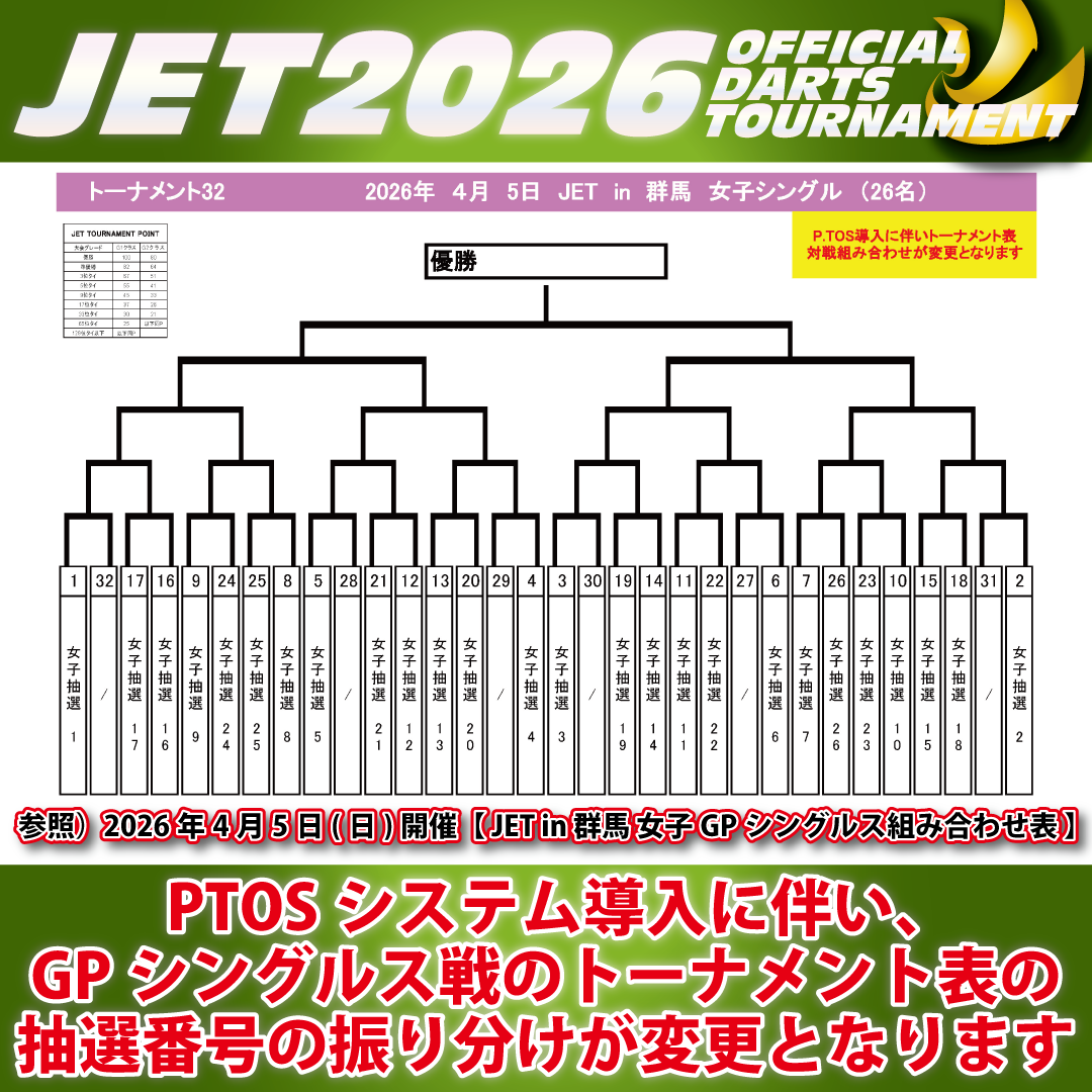 NEWSお知らせ 2026.03.31 GPシングルス対戦組み合わせが変更となります JET2026、PTOSシステム導入に伴い、 GPシングルス戦のトーナメントの 対戦組み合わせが以下のように変更となります ( 4月 5日開催 群馬大会参照 ) ~従来~ トーナメント表Aブロックの左から M1(L1) ~ での抽選振り分けとなっておりました ⇩ 変更後 ~群馬大会より~ 抽選番号をトーナメント表、対角にて振り分けとなります ご確認、ご了承の程よろしくお願いいたします 一覧に戻る 2026 JET OFFICIAL SPONSORS Facebook JET DARTS Tournament Instagram 2026年 4月 5日(日) 【 JET in 群馬 】G1 会場:ビエント⾼崎(ビッグキューブ)に 2026年 4月 5日(日) 【 JET in 群馬 】G1 会場:ビエント⾼崎(ビッグキューブ)に 2026年 4月 5日(日) 【 JET in 群馬 】G1 ~ご確認をお願いします~ お名前、性別 2026年 4月 5日(日) 【 JET in 群馬 】G1 ~エントリーリスト更新しました~ お名 2026年 4月 5日(日) 【 JET in 群馬 】G1 エントリー締切りが迫っております! ま 2026年 4月 5日(日) 【 JET in 群馬 】G1 エントリー締切りが 明日 3月 25日 JET2026 ~現在 4大会のエントリー受付中~ 2026年 4月 5日(日) 【 JET in 2026年 3月 15日(日) 【 JET in 静岡 】G1 会場:ツインメッセ静岡 にて開催! 2026年 3月 15日(日) 【 JET in 静岡 】G1 ~ GAME ON ! ~ JET 公式Instagramをフォロー ホーム お知らせNEW JETについて 大会規約 大会日程 大会結果 ランキング JETプレイヤー ギャラリー お問い合わせ