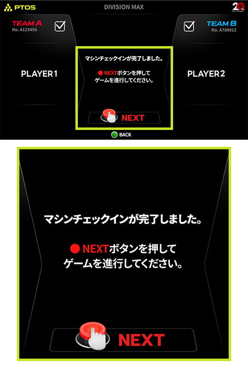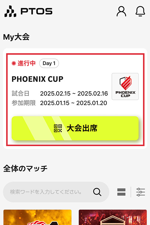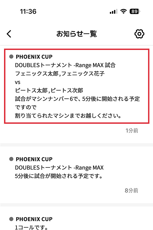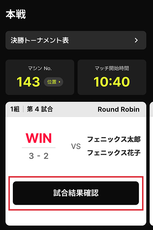 「Myマッチ」画面で、試合が行われるマシン番号や試合時間が確認できます。