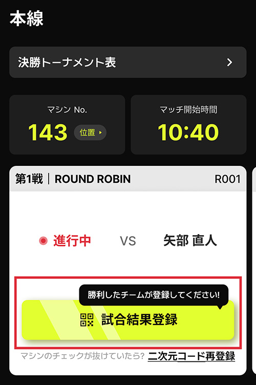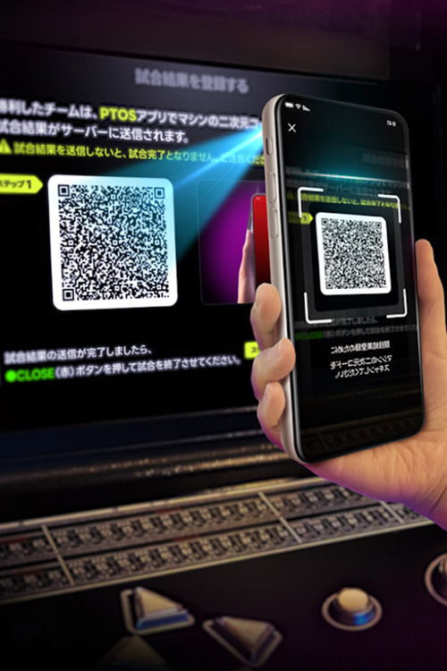 試合が終了したら、勝利チームの代表者が、マシンに表示された試合結果の2次元コードをスキャンし、データを送信します。