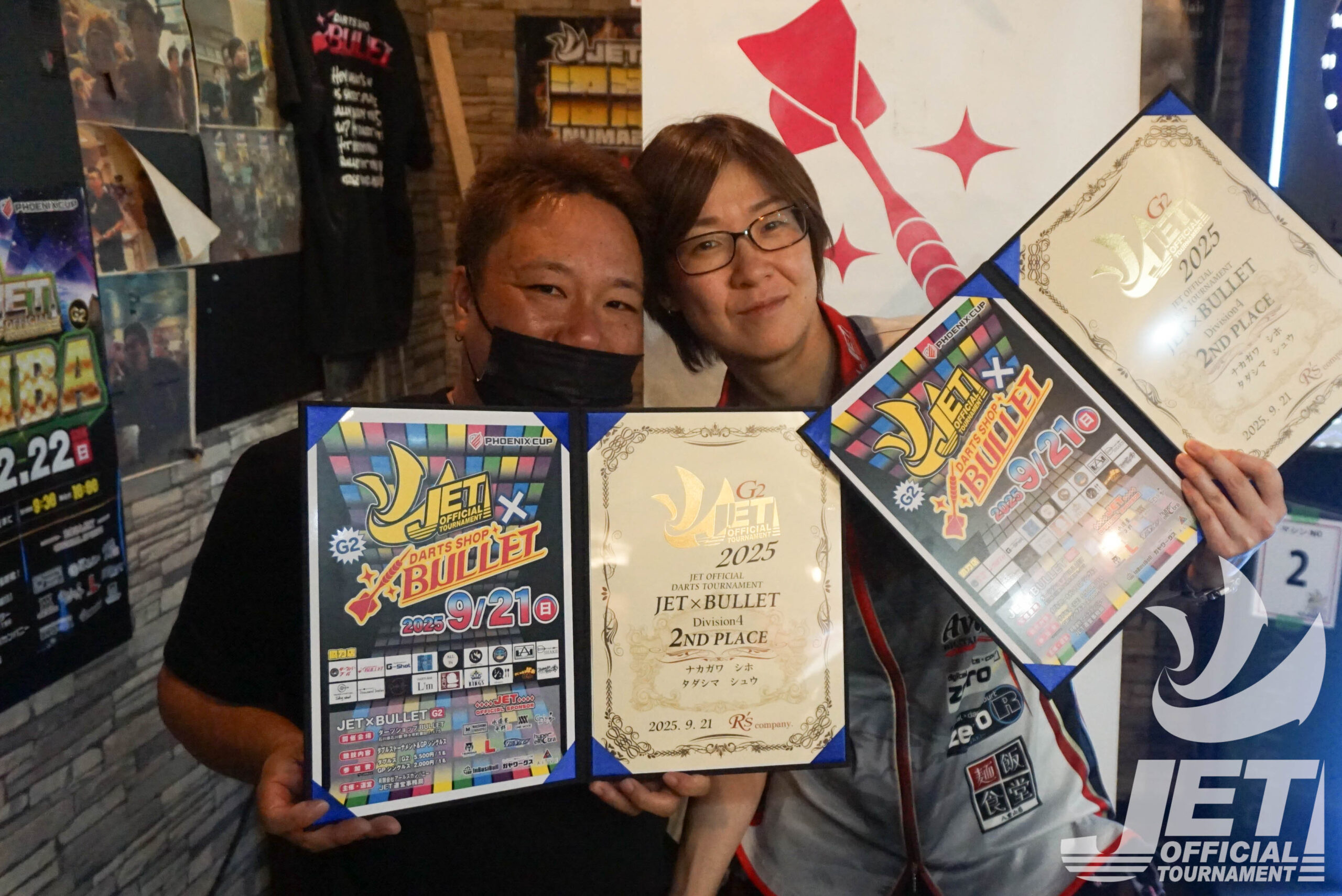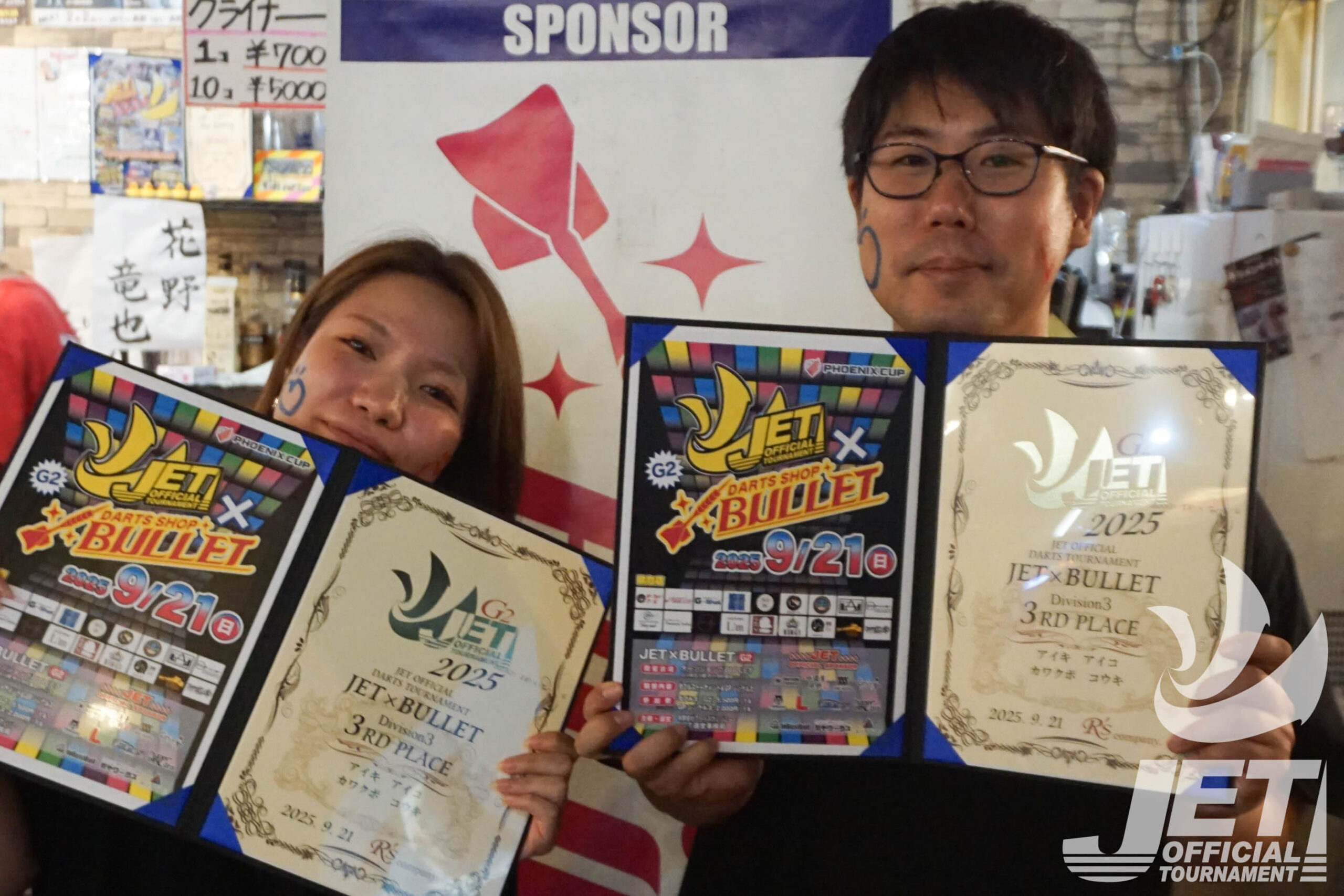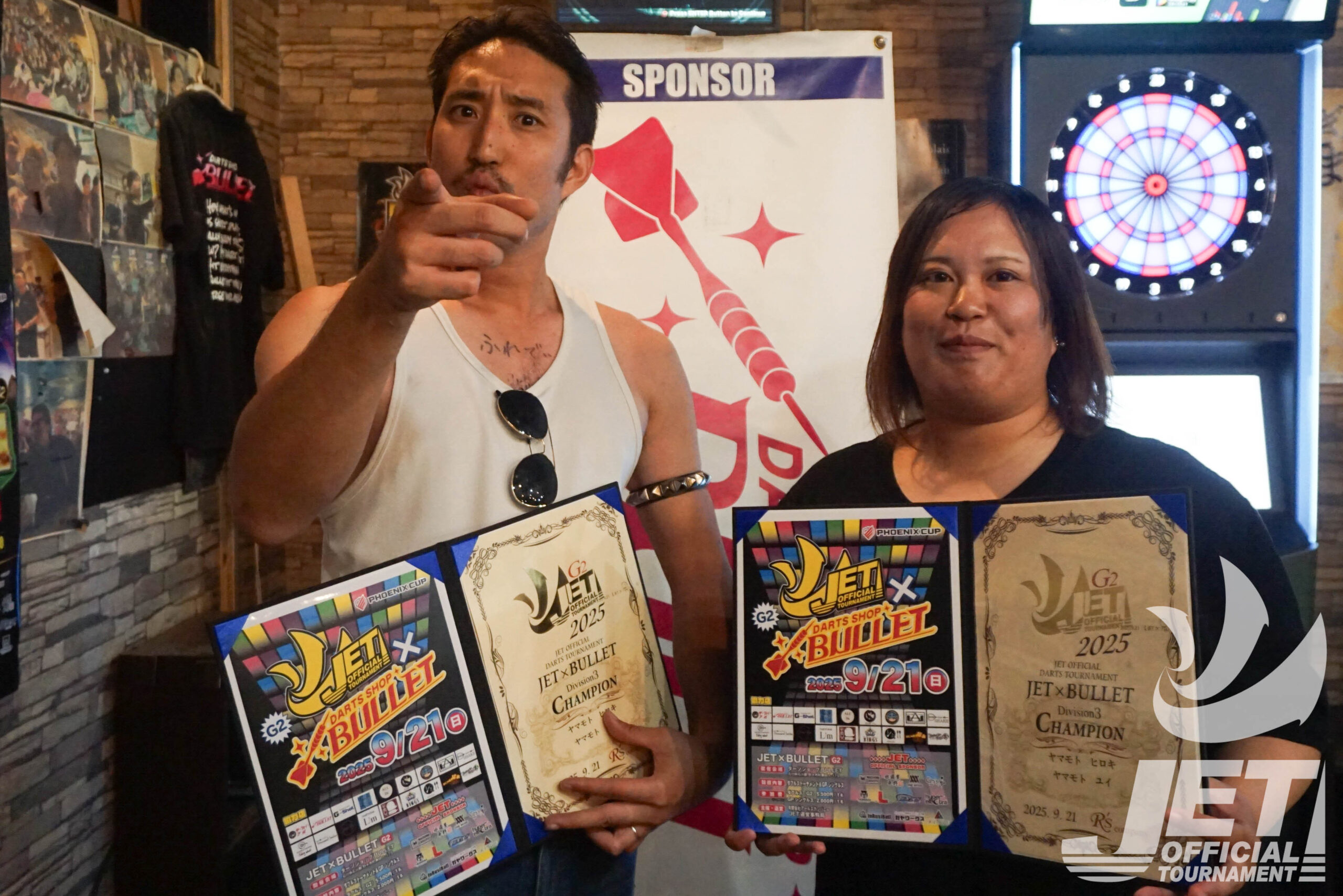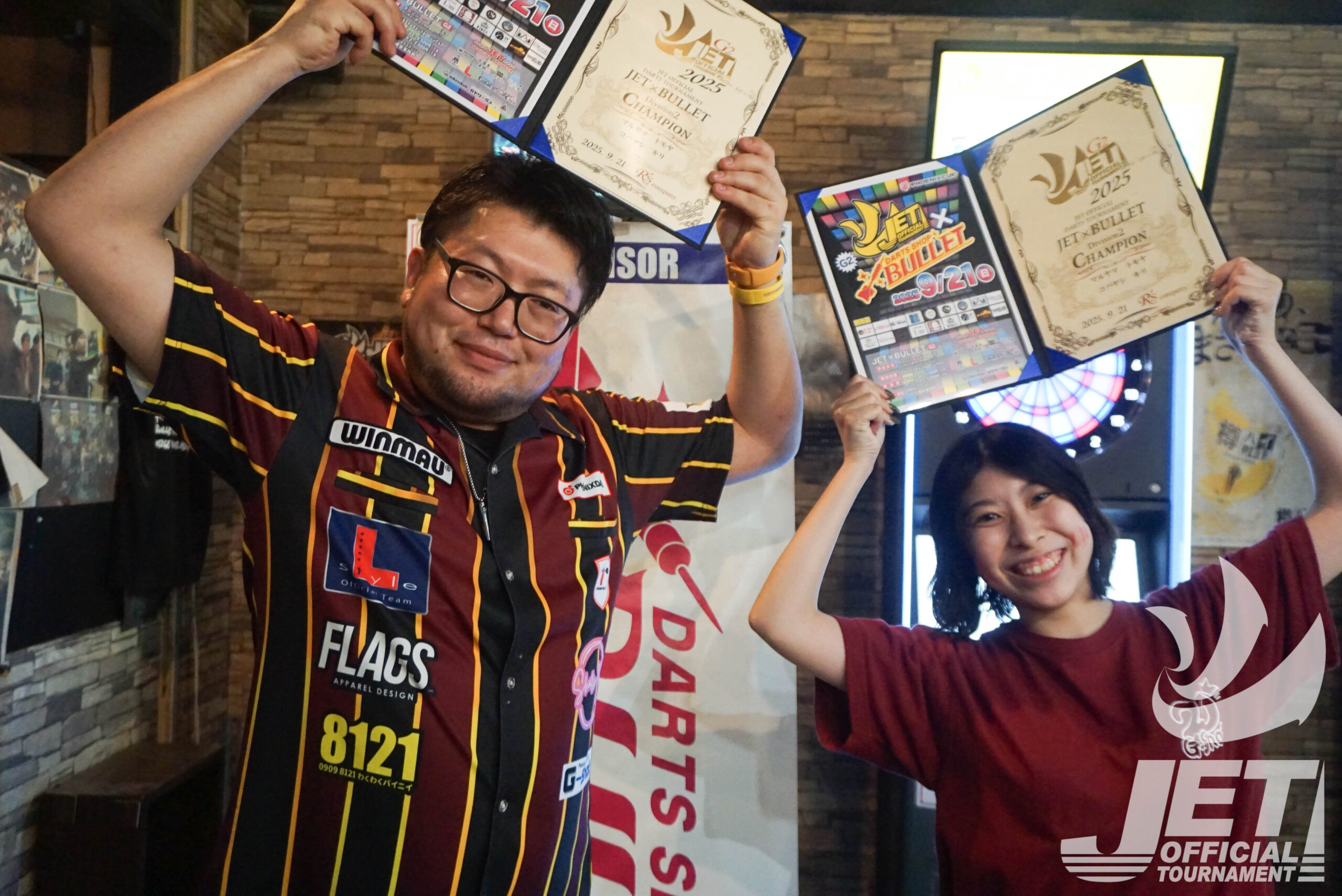 RESULTJET × BULLET 男子GPシングル 優勝 タカハシ リョウ (80 pt) (ALL IN) 準優勝 ナカムラ ユウキ (64 pt) (FUN PLACES) 3位タイ シマザキ ユウスケ (51 pt) (Amuse&Drunk Hang out) 3位タイ カワカミ マナブ (51 pt) (ダーツ&ビリヤード BAR バレット) 女子GPシングル 優勝 ナカガワ シホ (80 pt) (ALL IN) 準優勝 モリタ リナ (64 pt) (かじゅあるばぁ ぜろ。) 3位タイ ムラセ サヤカ (51 pt) (FUN PLACES) 3位タイ ハヤセ ミナミ (51 pt) (zero R) DIVISION-1 優勝 チョウトクダニ リョウスケ ミヤサカ タカヒロ (16 pt) (ダーツバー BULL) 準優勝 タカハシ リョウ ナエシロ ユウキ (12 pt) (ALL IN) 3位タイ ヨコヤマ カイスケ ミズカミ カズヤ (8 pt) (ダーツバー BULL) 3位タイ ムラタ ショウ ムラセ サヤカ (8 pt) (FUN PLACES) DIVISION-2 優勝 マルヤマ トモヤ コバヤシ キリ (16 pt) (POOL&DARTSBAR G-Shot) 準優勝 タケハラ ダイチ マツイ エリカ (12 pt) (Amuse&Drunk Hang out) 3位タイ コエダ ユウスケ タカムラ ハヤト (8 pt) (BAD BIRDY) 3位タイ ヤスバ トモヤ ヤスバ コウセイ (8 pt) (安-Bartic) DIVISION-3 優勝 ヤマモト ヒロキ ヤマモト ユイ (16 pt) (POOL&DARTSBAR G-Shot) 準優勝 アサクラ タイコウ ヨシダ マサヒト (12 pt) (ダーツ&ビリヤード BAR バレット) 3位タイ サイトウ カズヤ マツイ ナナ (8 pt) (BAR たらふく) 3位タイ アイキ アイコ カワクボ コウキ (8 pt) (Shallo-Bar) DIVISION-4 優勝 ナカタニ コウジ トクヤマ ナツキ (16 pt) (1/2 nibuichi) 準優勝 ナカガワ シホ タダシマ シュウ (12 pt) (ALL IN) 3位タイ アサカ ユウスケ スギモト マサユキ (8 pt) (安-Bartic) 3位タイ コマツ ミノル タカタ ミツヒロ (8 pt) (ダーツ&ビリヤード BAR バレット) DIVISION-5 優勝 ノザワ ヨシヒト ヤマザキ タマオ (16 pt) (かじゅあるばぁ ぜろ。) 準優勝 ツネズミ カズキ ツネズミ ユキ (12 pt) (安-Bartic) 3位タイ オオヒラ ケイト イワサキ ゼン (8 pt) (ダーツバー BULL) 3位タイ モリタ ショウゴ フジイ セイゴウ (8 pt) (ruga) 2026 JET OFFICIAL SPONSORS Facebook JET DARTS Tournament Instagram JET2026 北信越エリア開幕戦! 2026年 3月 1日(日) 【 JET in 福井 】G1 JET2026 北信越エリア開幕戦! 2026年 3月 1日(日) 【 JET in 福井 】G1 2026年 3月 1日(日) 【 JET in 福井 】G1 会場:敦賀市きらめきみなと館にて開催! JET2026東海エリア開幕戦! 2026年 2月 8日(日) 【 JET × ダマデノッチェ 】G JET2026 東海エリア開幕戦! 2026年 2月 8日(日) 【 JET × ダマデノッチェ 】 JET2026 東海エリア開幕戦! 2026年 2月 8日(日) 【 JET × ダマデノッチェ 】 JET2026 開幕戦! 2026年 2月 1日(日) 【 JET in 西川口 】G2 会場:LI JET2026 東海エリア開幕戦! 2026年 2月 8日(日) 【 JET × ダマデノッチェ 】 JET2026 東海エリア開幕戦! 2026年 2月 8日(日) 【 JET × ダマデノッチェ 】 公式Instagramをフォロー ホーム JETについて 大会規約 大会日程 大会結果 ランキング JETプレイヤー ギャラリー お問い合わせ