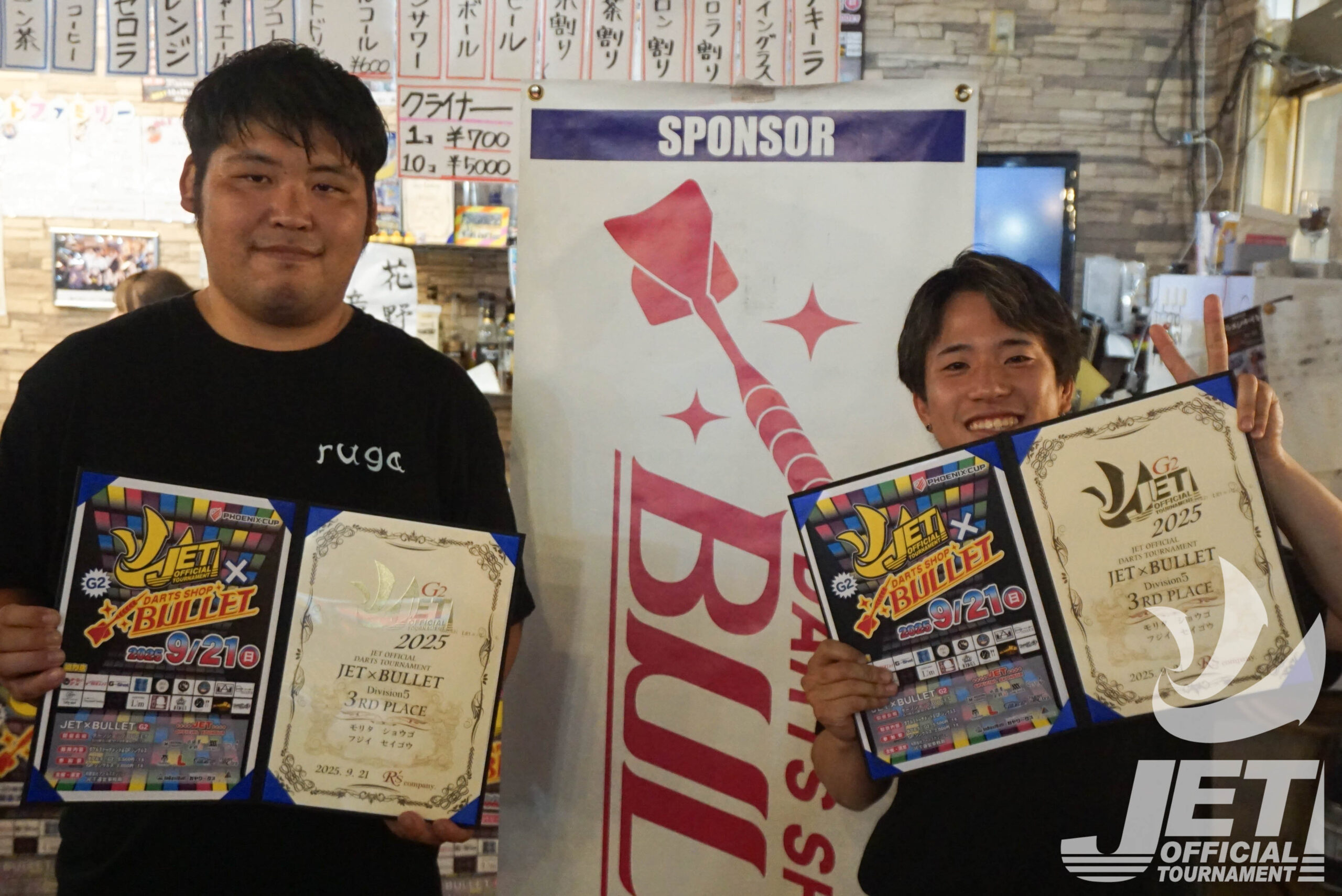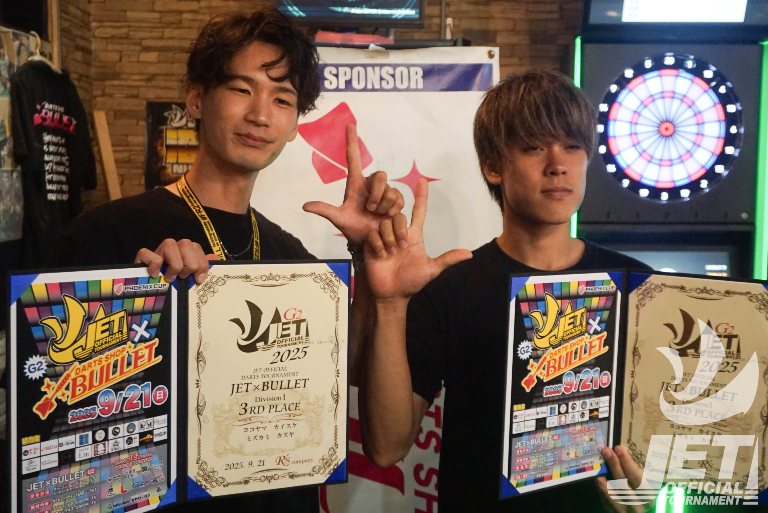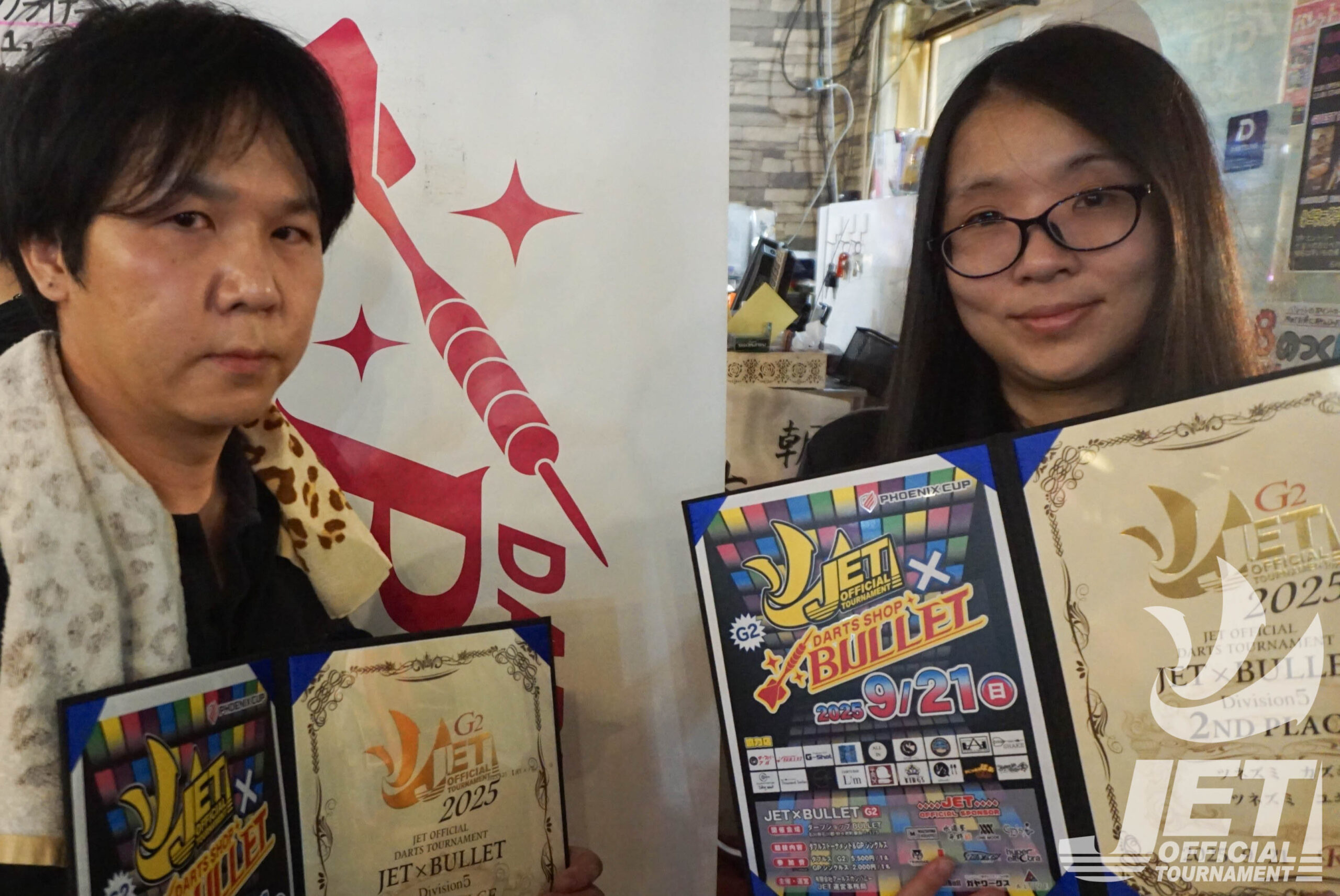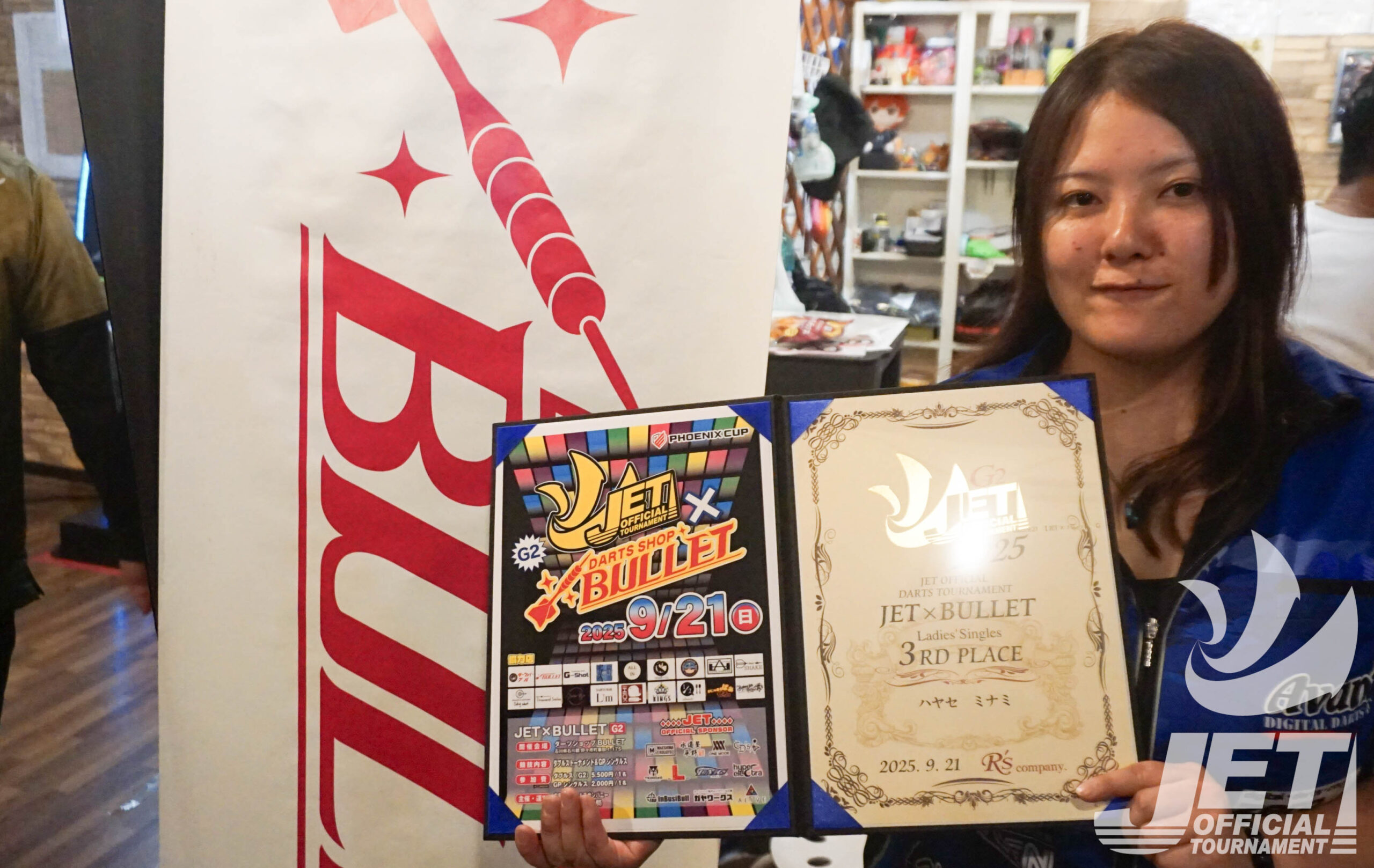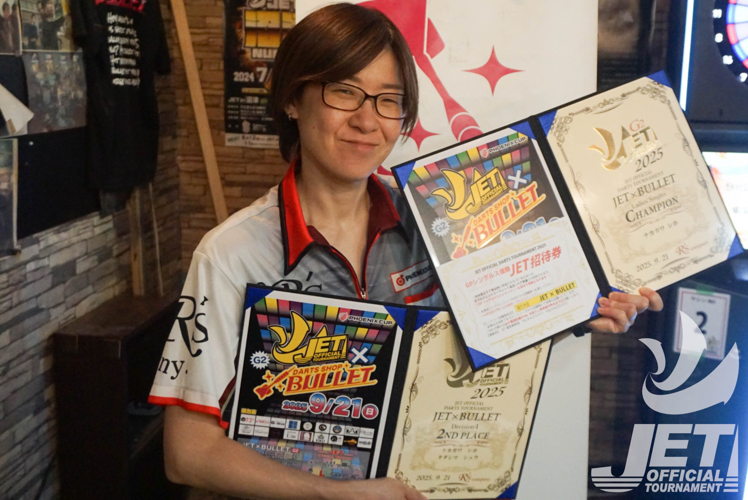 RESULTJET × BULLET 男子GPシングル 優勝 タカハシ リョウ (80 pt) (ALL IN) 準優勝 ナカムラ ユウキ (64 pt) (FUN PLACES) 3位タイ シマザキ ユウスケ (51 pt) (Amuse&Drunk Hang out) 3位タイ カワカミ マナブ (51 pt) (ダーツ&ビリヤード BAR バレット) 女子GPシングル 優勝 ナカガワ シホ (80 pt) (ALL IN) 準優勝 モリタ リナ (64 pt) (かじゅあるばぁ ぜろ。) 3位タイ ムラセ サヤカ (51 pt) (FUN PLACES) 3位タイ ハヤセ ミナミ (51 pt) (zero R) DIVISION-1 優勝 チョウトクダニ リョウスケ ミヤサカ タカヒロ (16 pt) (ダーツバー BULL) 準優勝 タカハシ リョウ ナエシロ ユウキ (12 pt) (ALL IN) 3位タイ ヨコヤマ カイスケ ミズカミ カズヤ (8 pt) (ダーツバー BULL) 3位タイ ムラタ ショウ ムラセ サヤカ (8 pt) (FUN PLACES) DIVISION-2 優勝 マルヤマ トモヤ コバヤシ キリ (16 pt) (POOL&DARTSBAR G-Shot) 準優勝 タケハラ ダイチ マツイ エリカ (12 pt) (Amuse&Drunk Hang out) 3位タイ コエダ ユウスケ タカムラ ハヤト (8 pt) (BAD BIRDY) 3位タイ ヤスバ トモヤ ヤスバ コウセイ (8 pt) (安-Bartic) DIVISION-3 優勝 ヤマモト ヒロキ ヤマモト ユイ (16 pt) (POOL&DARTSBAR G-Shot) 準優勝 アサクラ タイコウ ヨシダ マサヒト (12 pt) (ダーツ&ビリヤード BAR バレット) 3位タイ サイトウ カズヤ マツイ ナナ (8 pt) (BAR たらふく) 3位タイ アイキ アイコ カワクボ コウキ (8 pt) (Shallo-Bar) DIVISION-4 優勝 ナカタニ コウジ トクヤマ ナツキ (16 pt) (1/2 nibuichi) 準優勝 ナカガワ シホ タダシマ シュウ (12 pt) (ALL IN) 3位タイ アサカ ユウスケ スギモト マサユキ (8 pt) (安-Bartic) 3位タイ コマツ ミノル タカタ ミツヒロ (8 pt) (ダーツ&ビリヤード BAR バレット) DIVISION-5 優勝 ノザワ ヨシヒト ヤマザキ タマオ (16 pt) (かじゅあるばぁ ぜろ。) 準優勝 ツネズミ カズキ ツネズミ ユキ (12 pt) (安-Bartic) 3位タイ オオヒラ ケイト イワサキ ゼン (8 pt) (ダーツバー BULL) 3位タイ モリタ ショウゴ フジイ セイゴウ (8 pt) (ruga) 2026 JET OFFICIAL SPONSORS Facebook JET DARTS Tournament Instagram JET2026 北信越エリア開幕戦! 2026年 3月 1日(日) 【 JET in 福井 】G1 JET2026 北信越エリア開幕戦! 2026年 3月 1日(日) 【 JET in 福井 】G1 2026年 3月 1日(日) 【 JET in 福井 】G1 会場:敦賀市きらめきみなと館にて開催! JET2026東海エリア開幕戦! 2026年 2月 8日(日) 【 JET × ダマデノッチェ 】G JET2026 東海エリア開幕戦! 2026年 2月 8日(日) 【 JET × ダマデノッチェ 】 JET2026 東海エリア開幕戦! 2026年 2月 8日(日) 【 JET × ダマデノッチェ 】 JET2026 開幕戦! 2026年 2月 1日(日) 【 JET in 西川口 】G2 会場:LI JET2026 東海エリア開幕戦! 2026年 2月 8日(日) 【 JET × ダマデノッチェ 】 JET2026 東海エリア開幕戦! 2026年 2月 8日(日) 【 JET × ダマデノッチェ 】 公式Instagramをフォロー ホーム JETについて 大会規約 大会日程 大会結果 ランキング JETプレイヤー ギャラリー お問い合わせ
