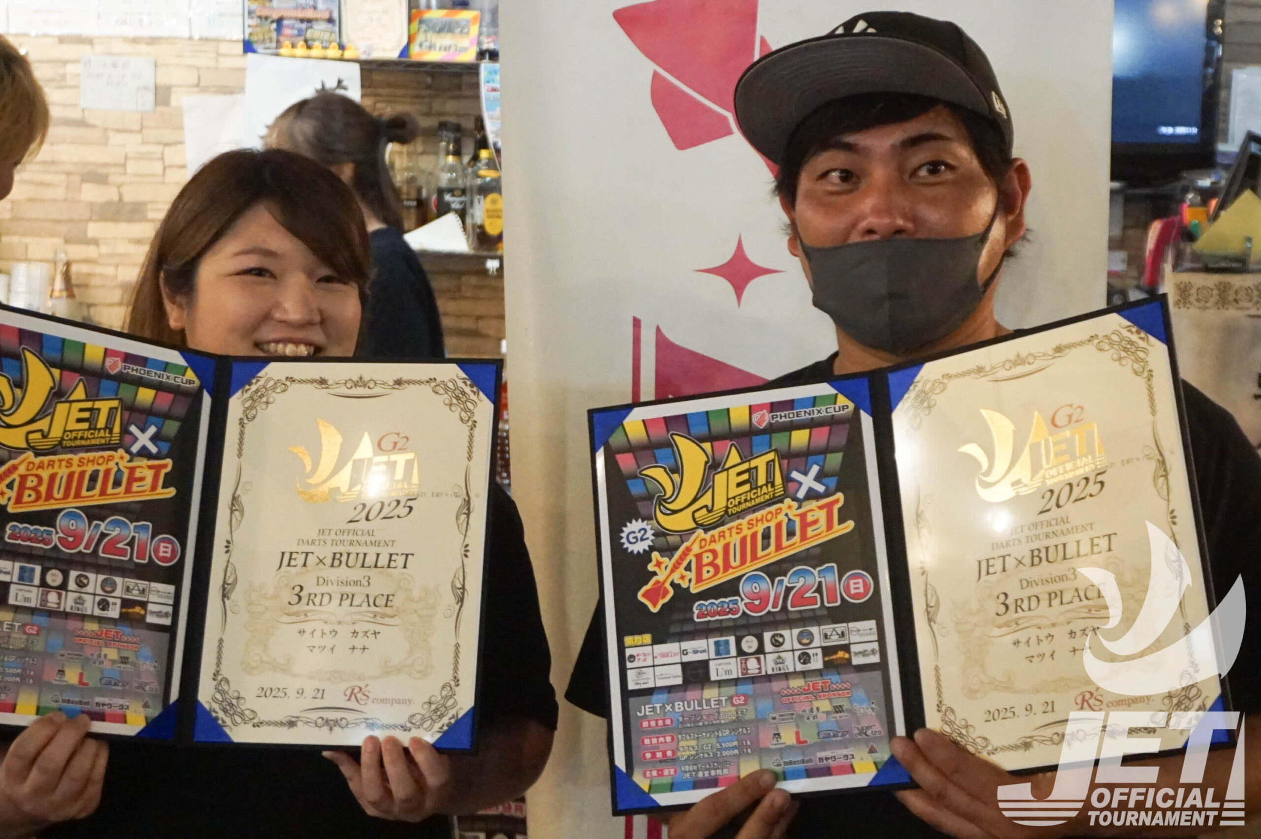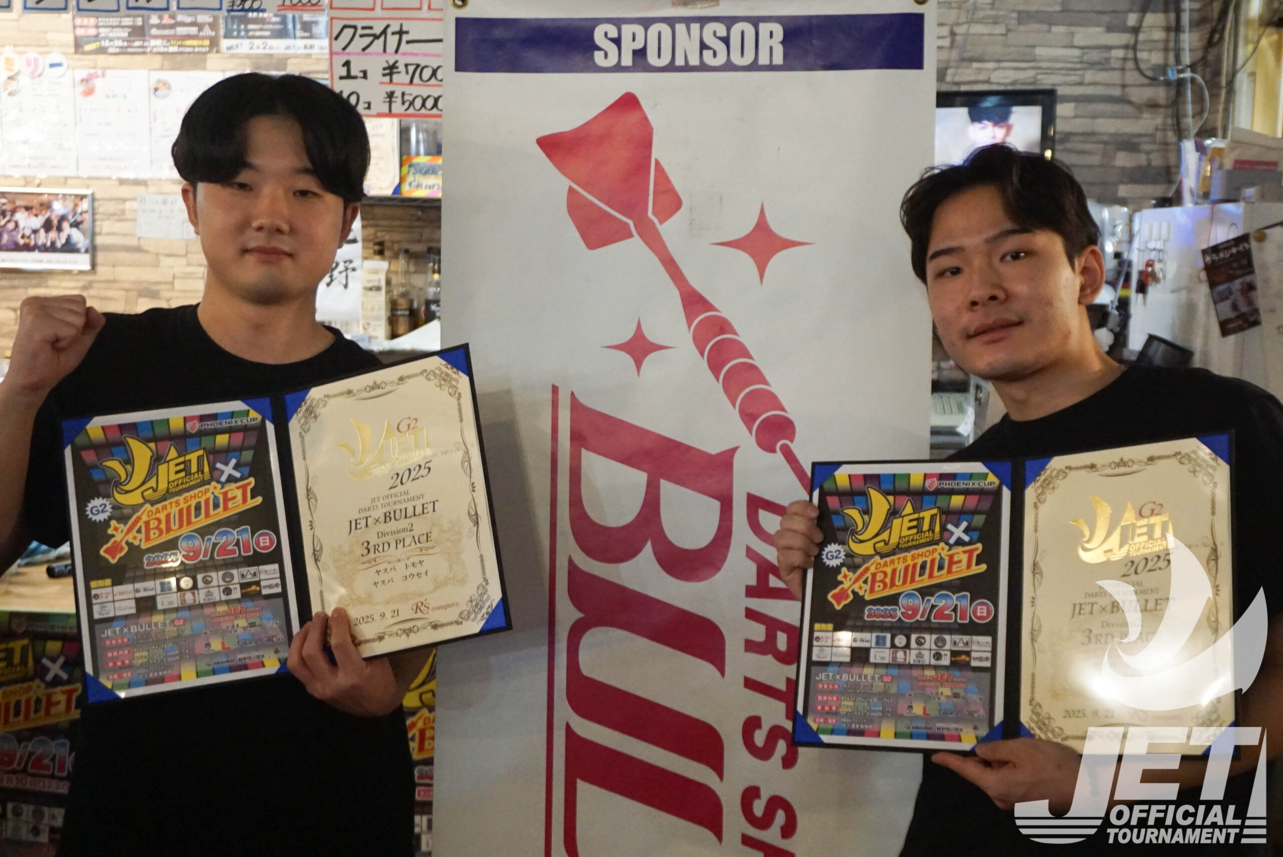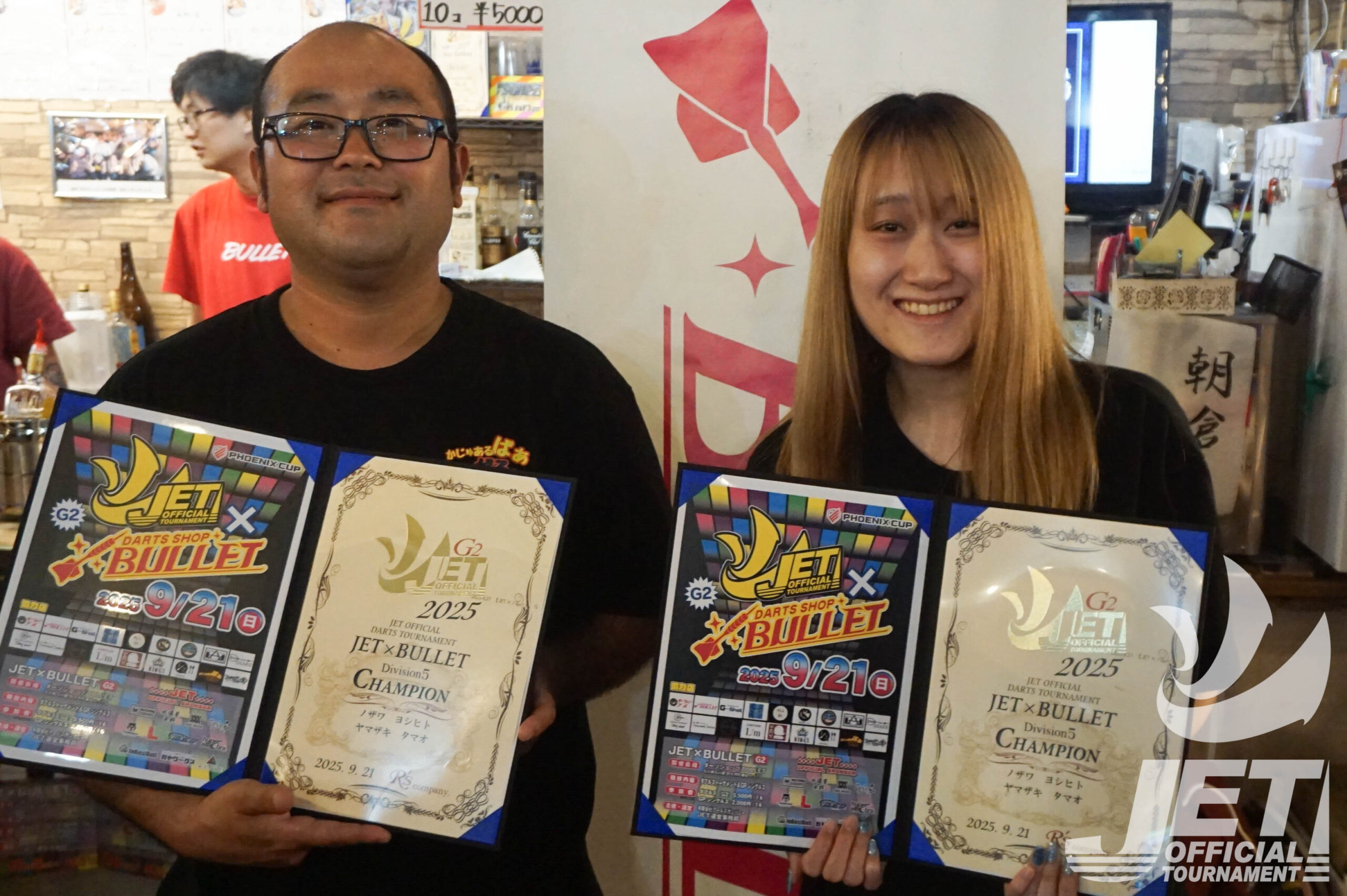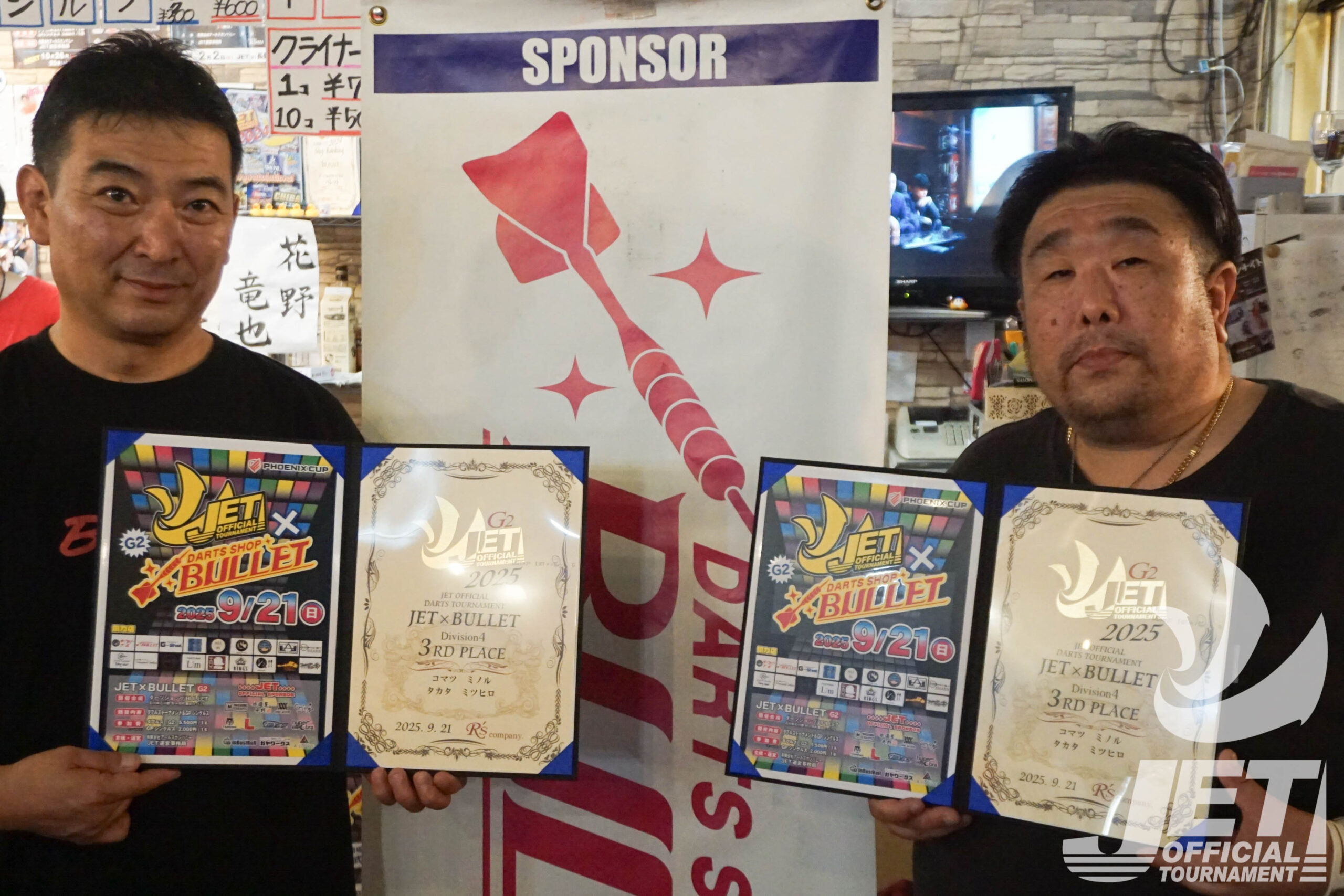 RESULTJET × BULLET 男子GPシングル 優勝 タカハシ リョウ (80 pt) (ALL IN) 準優勝 ナカムラ ユウキ (64 pt) (FUN PLACES) 3位タイ シマザキ ユウスケ (51 pt) (Amuse&Drunk Hang out) 3位タイ カワカミ マナブ (51 pt) (ダーツ&ビリヤード BAR バレット) 女子GPシングル 優勝 ナカガワ シホ (80 pt) (ALL IN) 準優勝 モリタ リナ (64 pt) (かじゅあるばぁ ぜろ。) 3位タイ ムラセ サヤカ (51 pt) (FUN PLACES) 3位タイ ハヤセ ミナミ (51 pt) (zero R) DIVISION-1 優勝 チョウトクダニ リョウスケ ミヤサカ タカヒロ (16 pt) (ダーツバー BULL) 準優勝 タカハシ リョウ ナエシロ ユウキ (12 pt) (ALL IN) 3位タイ ヨコヤマ カイスケ ミズカミ カズヤ (8 pt) (ダーツバー BULL) 3位タイ ムラタ ショウ ムラセ サヤカ (8 pt) (FUN PLACES) DIVISION-2 優勝 マルヤマ トモヤ コバヤシ キリ (16 pt) (POOL&DARTSBAR G-Shot) 準優勝 タケハラ ダイチ マツイ エリカ (12 pt) (Amuse&Drunk Hang out) 3位タイ コエダ ユウスケ タカムラ ハヤト (8 pt) (BAD BIRDY) 3位タイ ヤスバ トモヤ ヤスバ コウセイ (8 pt) (安-Bartic) DIVISION-3 優勝 ヤマモト ヒロキ ヤマモト ユイ (16 pt) (POOL&DARTSBAR G-Shot) 準優勝 アサクラ タイコウ ヨシダ マサヒト (12 pt) (ダーツ&ビリヤード BAR バレット) 3位タイ サイトウ カズヤ マツイ ナナ (8 pt) (BAR たらふく) 3位タイ アイキ アイコ カワクボ コウキ (8 pt) (Shallo-Bar) DIVISION-4 優勝 ナカタニ コウジ トクヤマ ナツキ (16 pt) (1/2 nibuichi) 準優勝 ナカガワ シホ タダシマ シュウ (12 pt) (ALL IN) 3位タイ アサカ ユウスケ スギモト マサユキ (8 pt) (安-Bartic) 3位タイ コマツ ミノル タカタ ミツヒロ (8 pt) (ダーツ&ビリヤード BAR バレット) DIVISION-5 優勝 ノザワ ヨシヒト ヤマザキ タマオ (16 pt) (かじゅあるばぁ ぜろ。) 準優勝 ツネズミ カズキ ツネズミ ユキ (12 pt) (安-Bartic) 3位タイ オオヒラ ケイト イワサキ ゼン (8 pt) (ダーツバー BULL) 3位タイ モリタ ショウゴ フジイ セイゴウ (8 pt) (ruga) 2026 JET OFFICIAL SPONSORS Facebook JET DARTS Tournament Instagram JET2026 北信越エリア開幕戦! 2026年 3月 1日(日) 【 JET in 福井 】G1 JET2026 北信越エリア開幕戦! 2026年 3月 1日(日) 【 JET in 福井 】G1 2026年 3月 1日(日) 【 JET in 福井 】G1 会場:敦賀市きらめきみなと館にて開催! JET2026東海エリア開幕戦! 2026年 2月 8日(日) 【 JET × ダマデノッチェ 】G JET2026 東海エリア開幕戦! 2026年 2月 8日(日) 【 JET × ダマデノッチェ 】 JET2026 東海エリア開幕戦! 2026年 2月 8日(日) 【 JET × ダマデノッチェ 】 JET2026 開幕戦! 2026年 2月 1日(日) 【 JET in 西川口 】G2 会場:LI JET2026 東海エリア開幕戦! 2026年 2月 8日(日) 【 JET × ダマデノッチェ 】 JET2026 東海エリア開幕戦! 2026年 2月 8日(日) 【 JET × ダマデノッチェ 】 公式Instagramをフォロー ホーム JETについて 大会規約 大会日程 大会結果 ランキング JETプレイヤー ギャラリー お問い合わせ