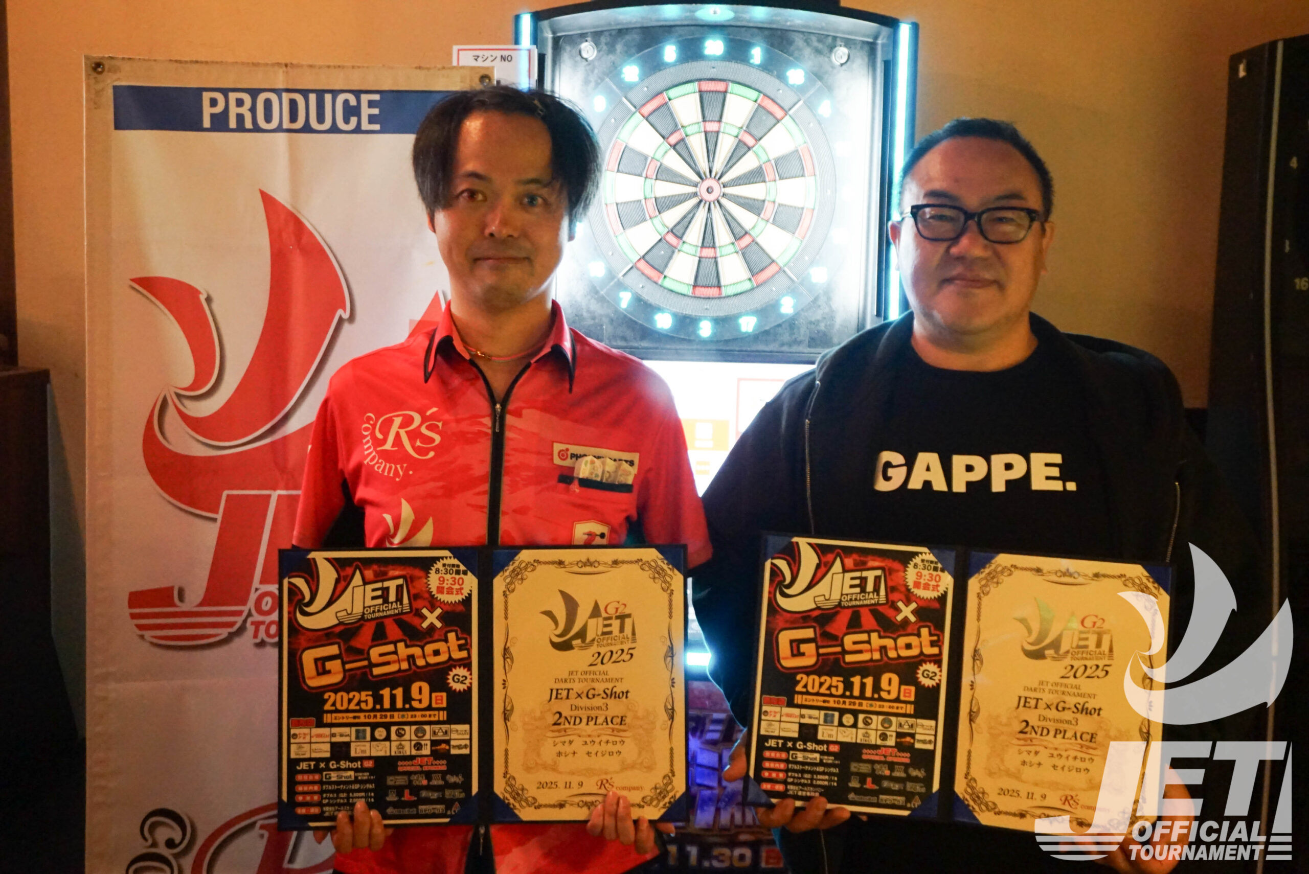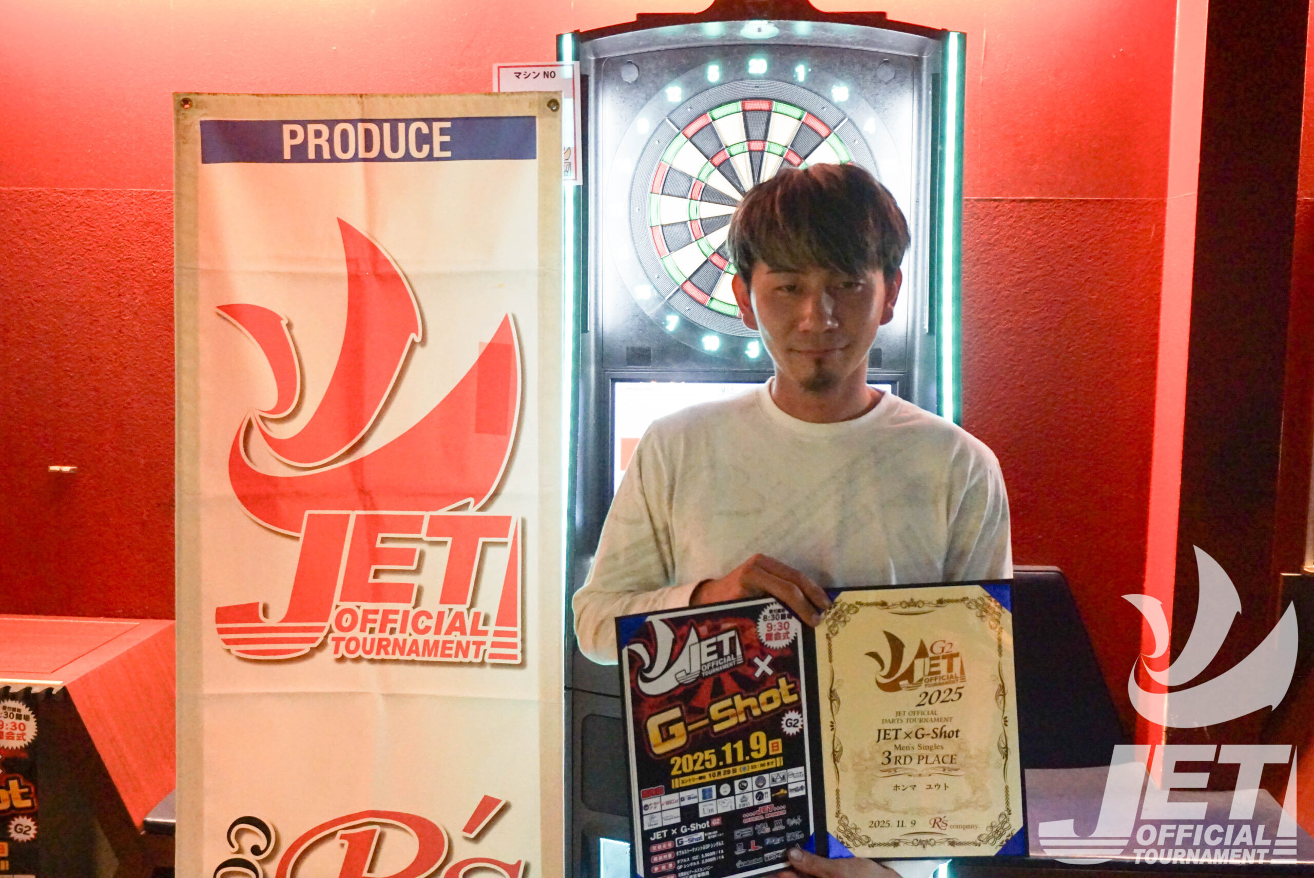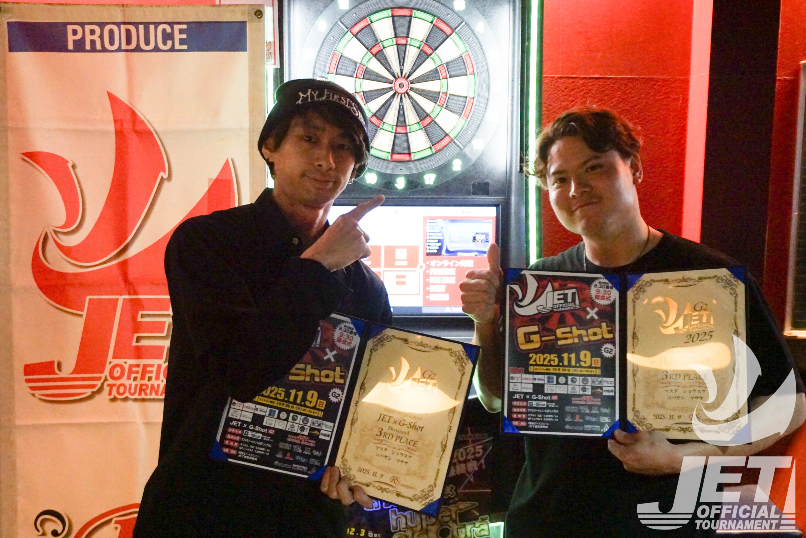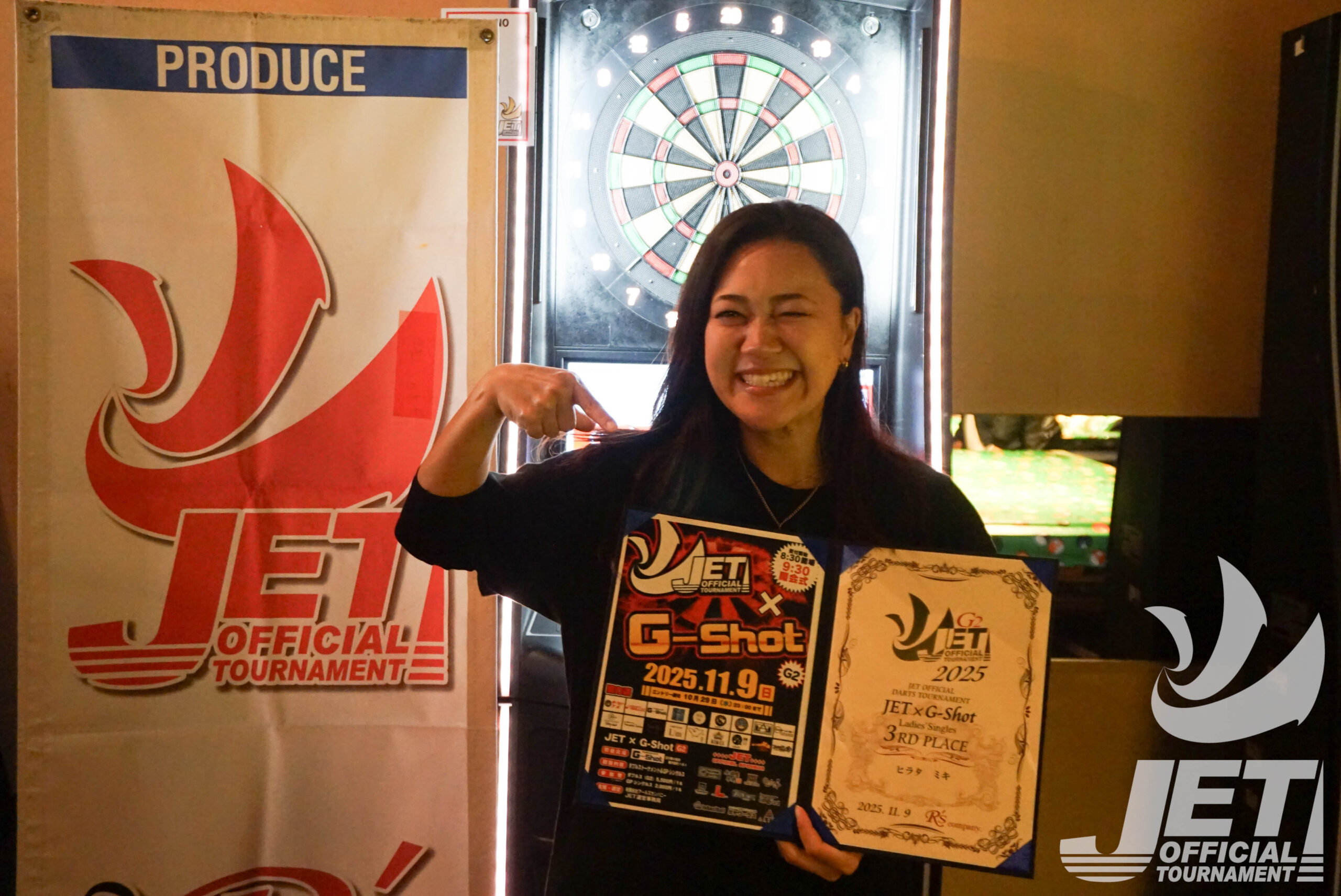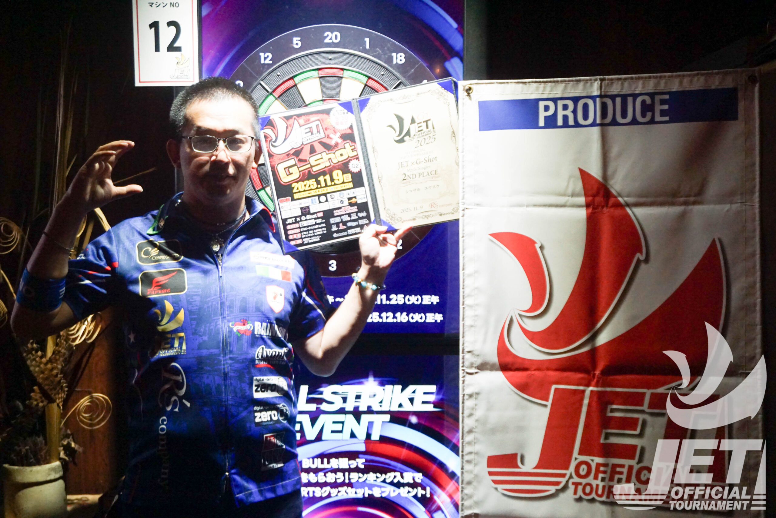 RESULTJET × G-Shot 男子GPシングル 優勝 ナカムラ ユウキ (80 pt) (FUN PLACES) 準優勝 シマザキ ユウスケ (64 pt) (Amuse&Drunk Hang out) 3位タイ ホンマ ユウト (51 pt) (FUN PLACES) 3位タイ タカハシ リョウ (51 pt) (ダーツショップ&Bar KINGS) 女子GPシングル 優勝 ナカムラ ユキコ (80 pt) (ダーツショップ&Bar KINGS) 準優勝 マツザワ リオ (64 pt) (BAR たらふく) 3位タイ ヒラタ ミキ (51 pt) (ruga) 3位タイ ムラセ サヤカ (51 pt) (FUN PLACES) DIVISION-1 優勝 イノ ショウキ ツキモリ カズヤ (16 pt) (Teru Cafe) 準優勝 ナカムラ ユウキ イトウ シュン (12 pt) (FUN PLACES) 3位タイ サイトウ カズヤ タガ カズヒロ (8 pt) (BAR たらふく) 3位タイ イナイ ヒロキ オガワ アキヒト (8 pt) (1/2 nibuichi) DIVISION-2 優勝 シマヤマ コウタロウ カワカミ マナブ (16 pt) (ダーツ&ビリヤード BAR バレット) 準優勝 ナエシロ ユウキ ナカガワ シホ (12 pt) (Darts Studio SPREAD) 3位タイ ババ コウイチ シラサキ サトシ (8 pt) (かじゅあるばぁ ぜろ。) 3位タイ シマザキ ユウスケ シマザキ サトカ (8 pt) (Amuse&Drunk Hang out) DIVISION-3 優勝 モリモト ヒロキ ナカジマ ユキ (16 pt) (かじゅあるばぁ ぜろ。) 準優勝 シマダ ユウイチロウ ホシナ セイジロウ (12 pt) (ダーツ&ビリヤード BAR バレット) 3位タイ タイラ ヤスヒト キタ マイコ (8 pt) (ダーツ&ビリヤード BAR バレット) 3位タイ スガハラ ヒロタカ タナカ ユウヤ (8 pt) (Boston Club) DIVISION-4 優勝 カスガ シンタロウ トビタ リナ (16 pt) (ruga) 準優勝 ハセガワ シンヤ イハラ タエコ (12 pt) (BAR たらふく) 3位タイ マスダ ショウスケ コバヤシ マサヤ (8 pt) (DARTS BAR Lim) 3位タイ フタギ カツキ アンドウ シュンヤ (8 pt) (DARTS&BAR Rodeo) DIVISION-5 優勝 ヨシタ ヨシフミ ヤマモト タイガ (16 pt) (darts×casualbar Stats) 準優勝 ウエキ ユウダイ ミヤザキ ショウタ (12 pt) (darts×casualbar Stats) 3位タイ オオヒラ ケイト アサクラ タイコウ (8 pt) (ダーツバー BULL) 3位タイ ホソイ ケン キハラ カヨコ (8 pt) (BAR たらふく) DIVISION-6 優勝 セキカワ アキラ セキカワ ユリコ (16 pt) (POOL&DARTSBAR G-Shot) 準優勝 マツイ ナナ アサダ ミレア (12 pt) (BAR たらふく) 3位タイ オノ アリア ミカワ ナツキ (8 pt) (POOL&DARTSBAR G-Shot) 3位タイ スエマサ リュウジ ムライ ケンタロウ (8 pt) (BAR たらふく) 2026 JET OFFICIAL SPONSORS Facebook JET DARTS Tournament Instagram JET2026 開幕戦! 2026年 2月 1日(日) 【 JET in 西川口 】G2 会場:LI 現在 2大会のエントリー受付開始しております JET2026 開幕戦! 2026年 2月 1日(日 JET2026 始動! ~エントリー方法が変わりました~ 本年度よりエントリーがスマートフォンより可 【 JET OFFICIAL DARTS TOURNAMENT 2025 】 お世話になっております JET2026 開幕戦! 2026年 2月 1日(日) 【 JET in 西川口 】G2 会場:LI 【 JET2025 全日程終了 】 ~ランキング確定しました~ 入賞された皆様、そして店舗様、 おめ JET2025 全日程終了 ~JETポイントランキング更新しました~ JET in 東京×hyper JET2025最終戦! 12月 14日(日) 【 JET in 東京×hyperelectra 】G JET2025最終戦! 12月 14日(日) 【 JET in 東京×hyperelectra 】G 公式Instagramをフォロー ホーム JETについて 大会規約 大会日程 大会結果 ランキング JETプレイヤー ギャラリー お問い合わせ