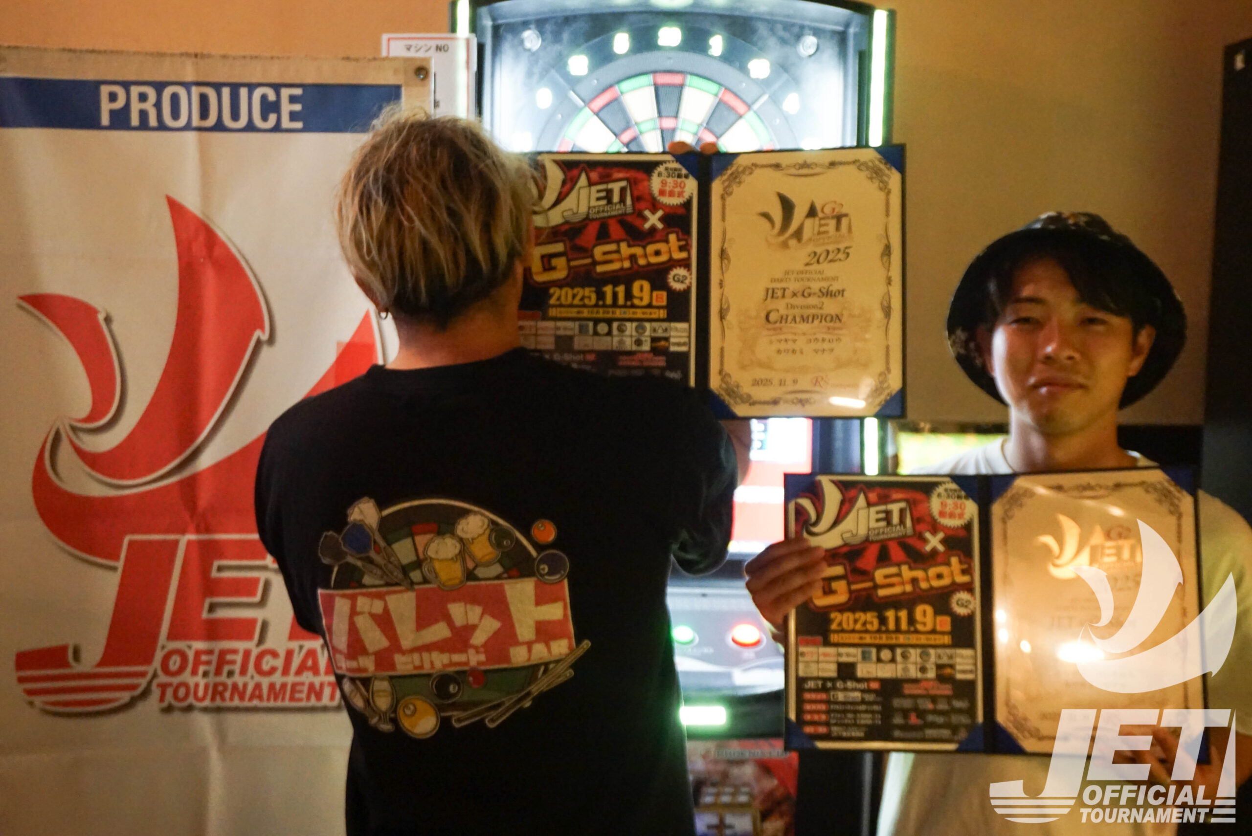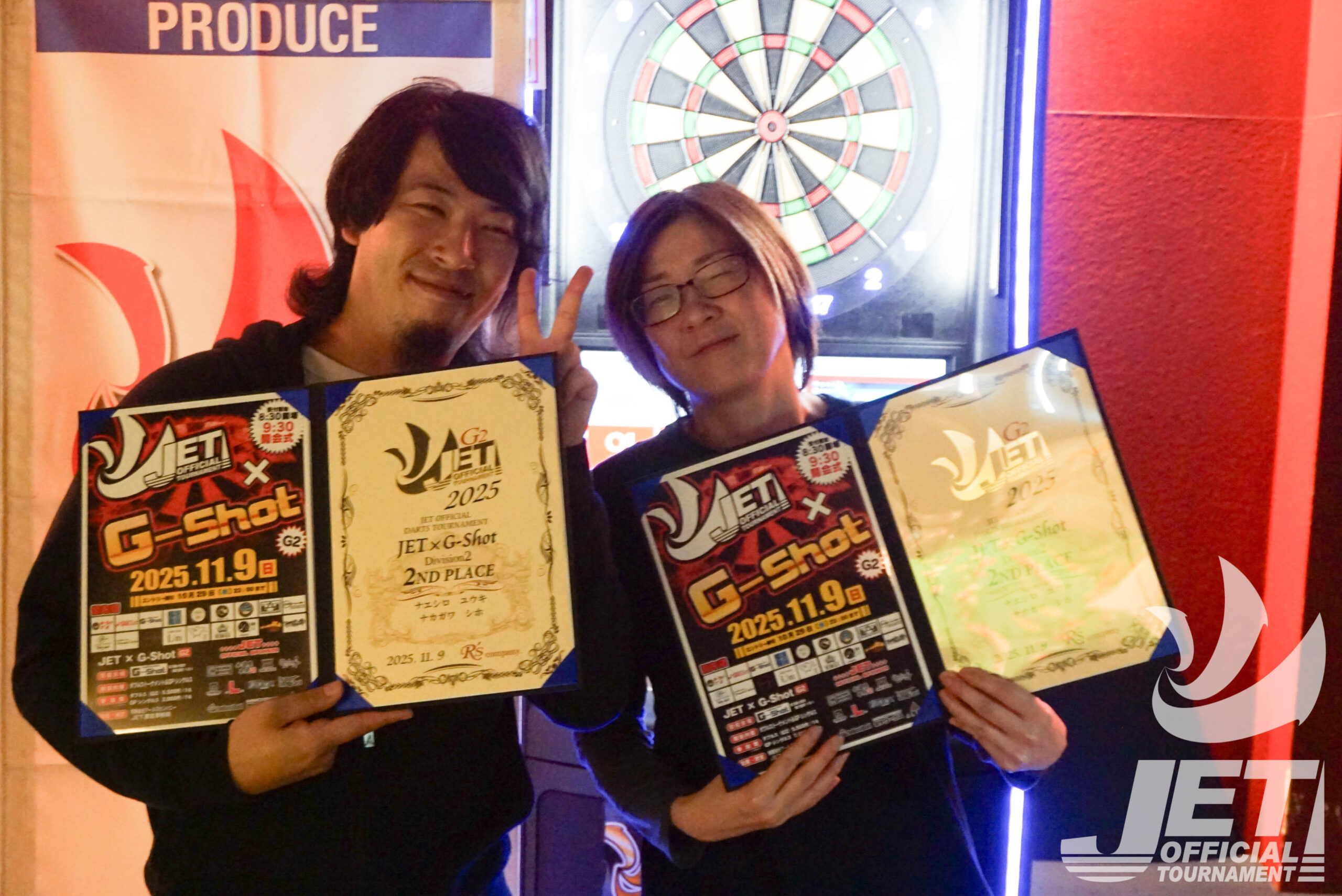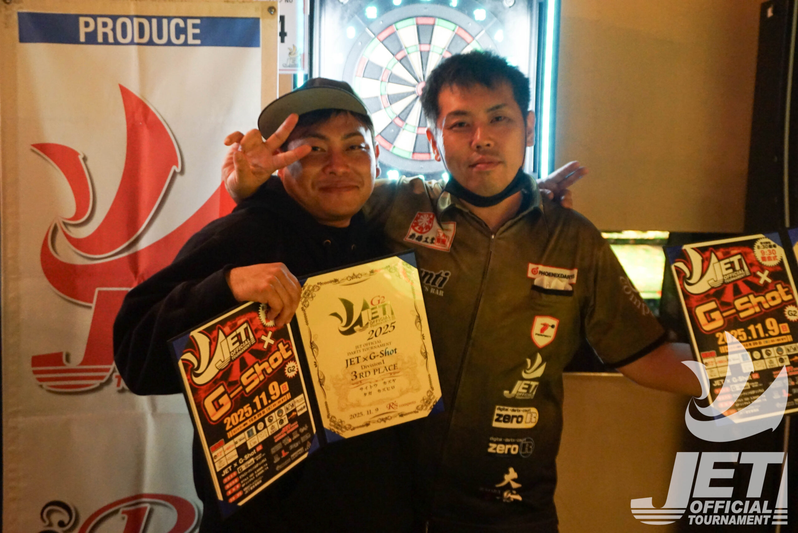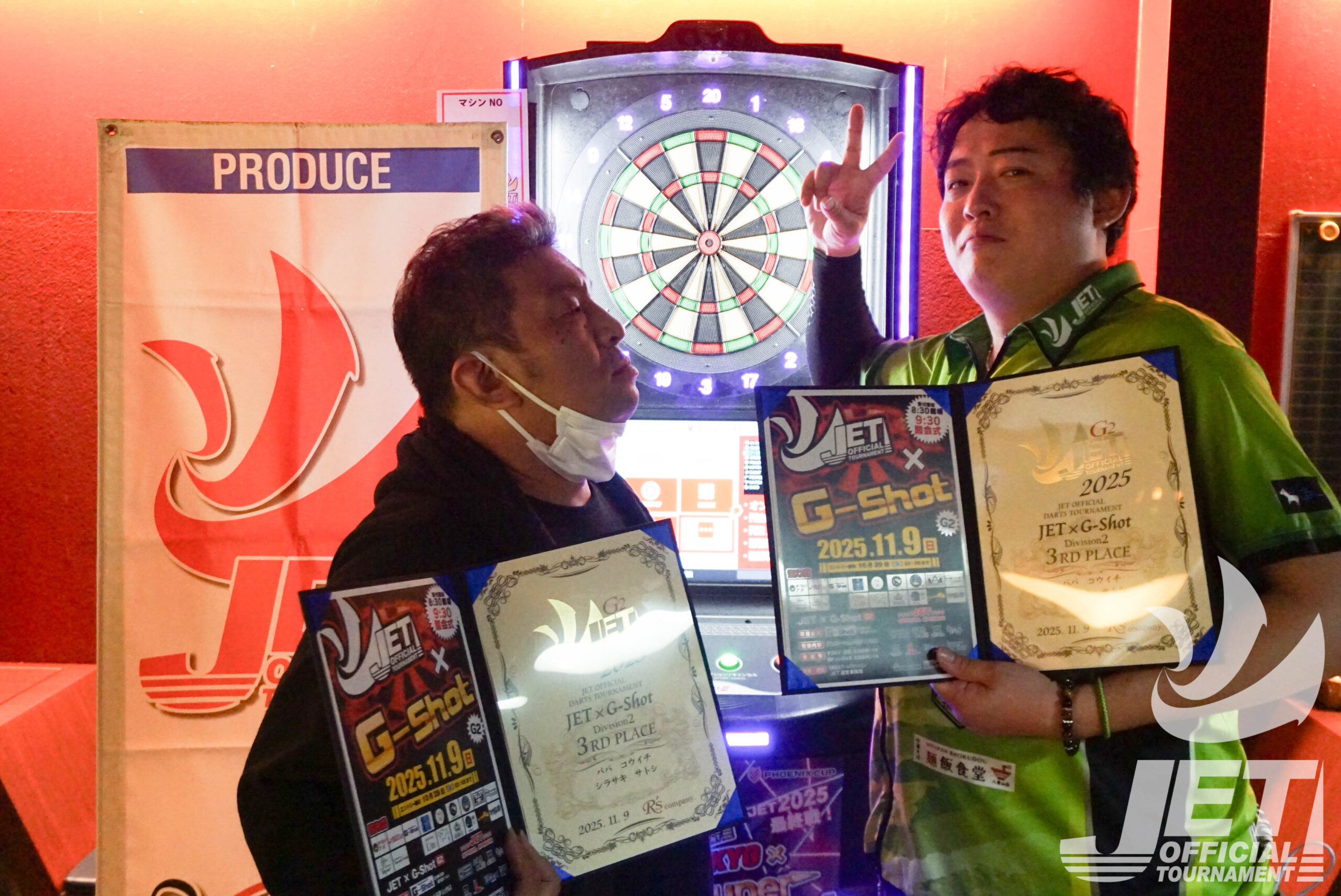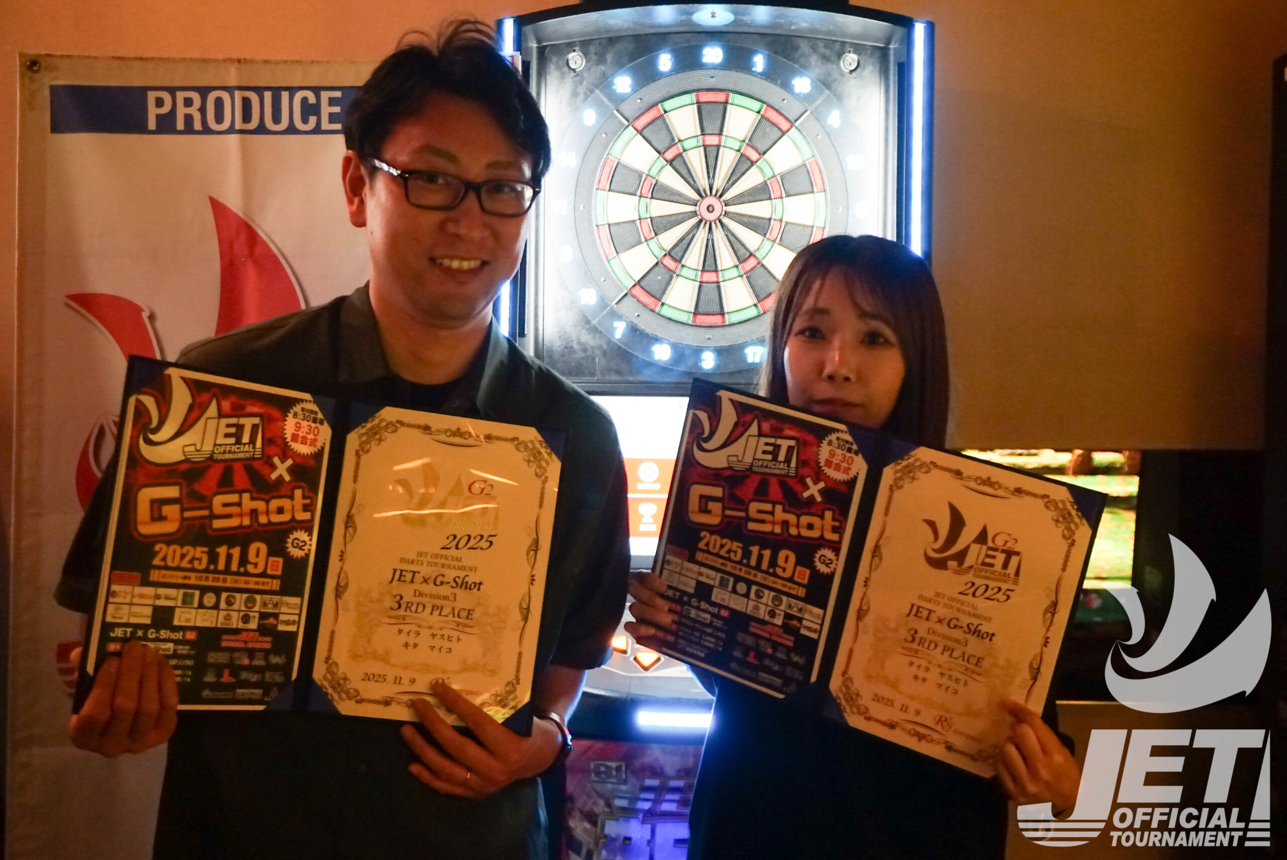 RESULTJET × G-Shot 男子GPシングル 優勝 ナカムラ ユウキ (80 pt) (FUN PLACES) 準優勝 シマザキ ユウスケ (64 pt) (Amuse&Drunk Hang out) 3位タイ ホンマ ユウト (51 pt) (FUN PLACES) 3位タイ タカハシ リョウ (51 pt) (ダーツショップ&Bar KINGS) 女子GPシングル 優勝 ナカムラ ユキコ (80 pt) (ダーツショップ&Bar KINGS) 準優勝 マツザワ リオ (64 pt) (BAR たらふく) 3位タイ ヒラタ ミキ (51 pt) (ruga) 3位タイ ムラセ サヤカ (51 pt) (FUN PLACES) DIVISION-1 優勝 イノ ショウキ ツキモリ カズヤ (16 pt) (Teru Cafe) 準優勝 ナカムラ ユウキ イトウ シュン (12 pt) (FUN PLACES) 3位タイ サイトウ カズヤ タガ カズヒロ (8 pt) (BAR たらふく) 3位タイ イナイ ヒロキ オガワ アキヒト (8 pt) (1/2 nibuichi) DIVISION-2 優勝 シマヤマ コウタロウ カワカミ マナブ (16 pt) (ダーツ&ビリヤード BAR バレット) 準優勝 ナエシロ ユウキ ナカガワ シホ (12 pt) (Darts Studio SPREAD) 3位タイ ババ コウイチ シラサキ サトシ (8 pt) (かじゅあるばぁ ぜろ。) 3位タイ シマザキ ユウスケ シマザキ サトカ (8 pt) (Amuse&Drunk Hang out) DIVISION-3 優勝 モリモト ヒロキ ナカジマ ユキ (16 pt) (かじゅあるばぁ ぜろ。) 準優勝 シマダ ユウイチロウ ホシナ セイジロウ (12 pt) (ダーツ&ビリヤード BAR バレット) 3位タイ タイラ ヤスヒト キタ マイコ (8 pt) (ダーツ&ビリヤード BAR バレット) 3位タイ スガハラ ヒロタカ タナカ ユウヤ (8 pt) (Boston Club) DIVISION-4 優勝 カスガ シンタロウ トビタ リナ (16 pt) (ruga) 準優勝 ハセガワ シンヤ イハラ タエコ (12 pt) (BAR たらふく) 3位タイ マスダ ショウスケ コバヤシ マサヤ (8 pt) (DARTS BAR Lim) 3位タイ フタギ カツキ アンドウ シュンヤ (8 pt) (DARTS&BAR Rodeo) DIVISION-5 優勝 ヨシタ ヨシフミ ヤマモト タイガ (16 pt) (darts×casualbar Stats) 準優勝 ウエキ ユウダイ ミヤザキ ショウタ (12 pt) (darts×casualbar Stats) 3位タイ オオヒラ ケイト アサクラ タイコウ (8 pt) (ダーツバー BULL) 3位タイ ホソイ ケン キハラ カヨコ (8 pt) (BAR たらふく) DIVISION-6 優勝 セキカワ アキラ セキカワ ユリコ (16 pt) (POOL&DARTSBAR G-Shot) 準優勝 マツイ ナナ アサダ ミレア (12 pt) (BAR たらふく) 3位タイ オノ アリア ミカワ ナツキ (8 pt) (POOL&DARTSBAR G-Shot) 3位タイ スエマサ リュウジ ムライ ケンタロウ (8 pt) (BAR たらふく) 2026 JET OFFICIAL SPONSORS Facebook JET DARTS Tournament Instagram JET2026 開幕戦! 2026年 2月 1日(日) 【 JET in 西川口 】G2 会場:LI 現在 2大会のエントリー受付開始しております JET2026 開幕戦! 2026年 2月 1日(日 JET2026 始動! ~エントリー方法が変わりました~ 本年度よりエントリーがスマートフォンより可 【 JET OFFICIAL DARTS TOURNAMENT 2025 】 お世話になっております JET2026 開幕戦! 2026年 2月 1日(日) 【 JET in 西川口 】G2 会場:LI 【 JET2025 全日程終了 】 ~ランキング確定しました~ 入賞された皆様、そして店舗様、 おめ JET2025 全日程終了 ~JETポイントランキング更新しました~ JET in 東京×hyper JET2025最終戦! 12月 14日(日) 【 JET in 東京×hyperelectra 】G JET2025最終戦! 12月 14日(日) 【 JET in 東京×hyperelectra 】G 公式Instagramをフォロー ホーム JETについて 大会規約 大会日程 大会結果 ランキング JETプレイヤー ギャラリー お問い合わせ