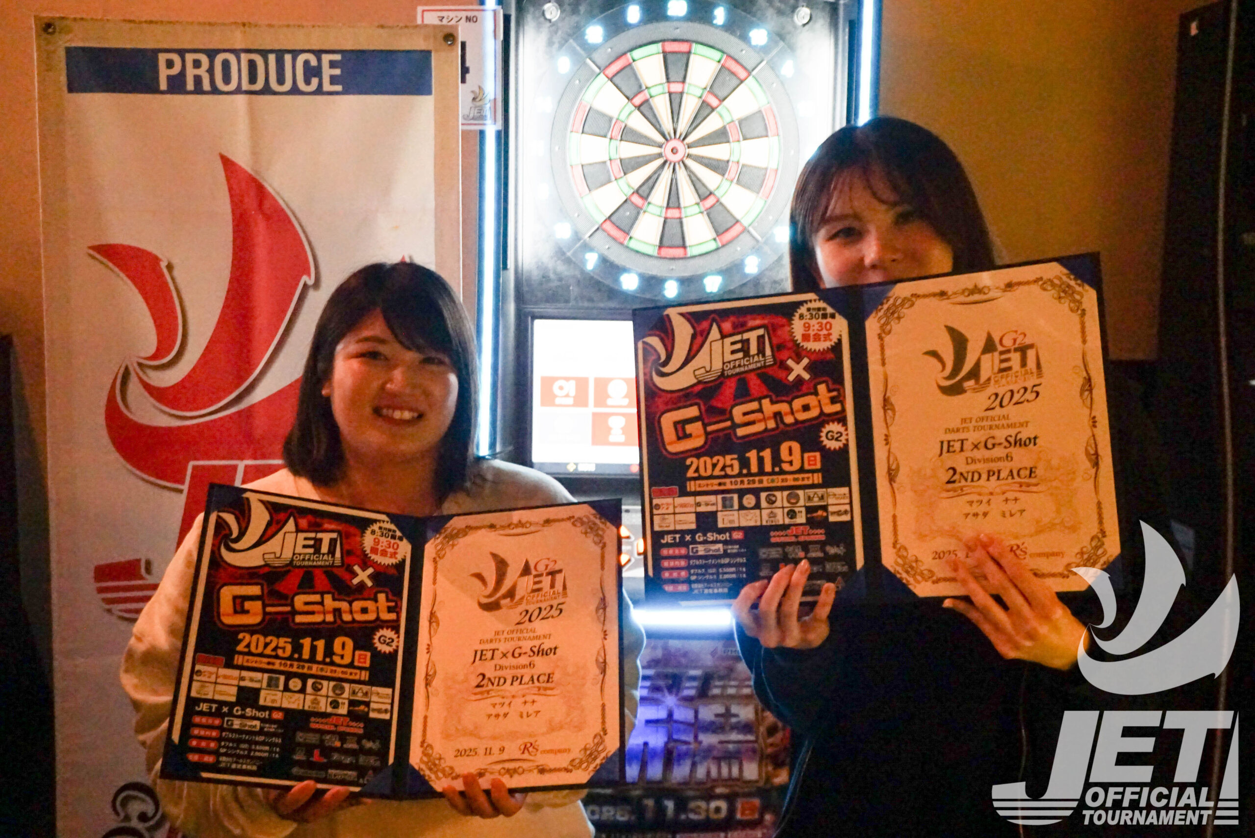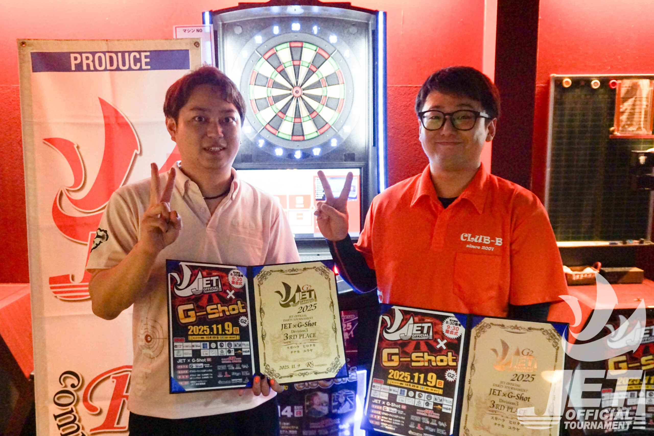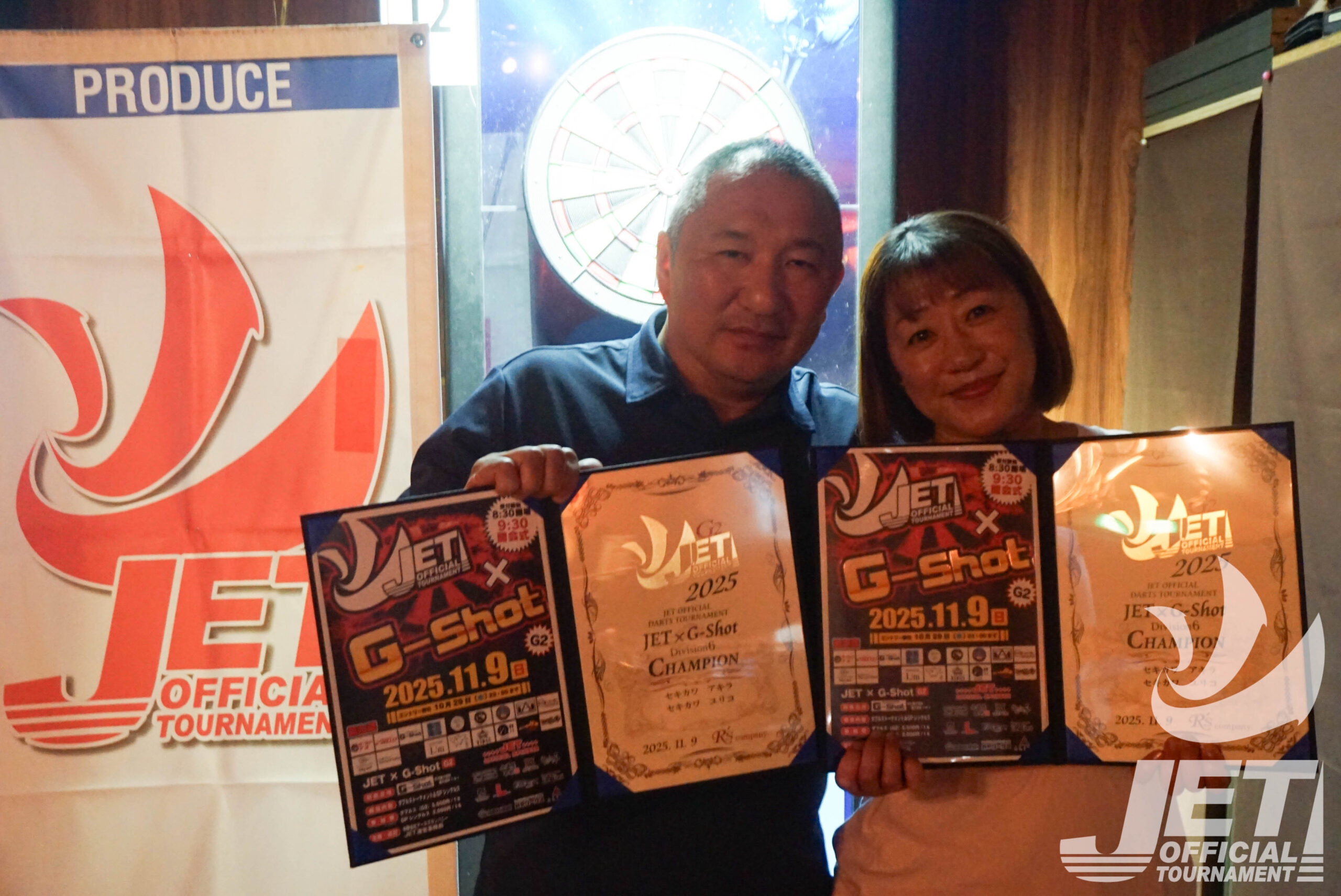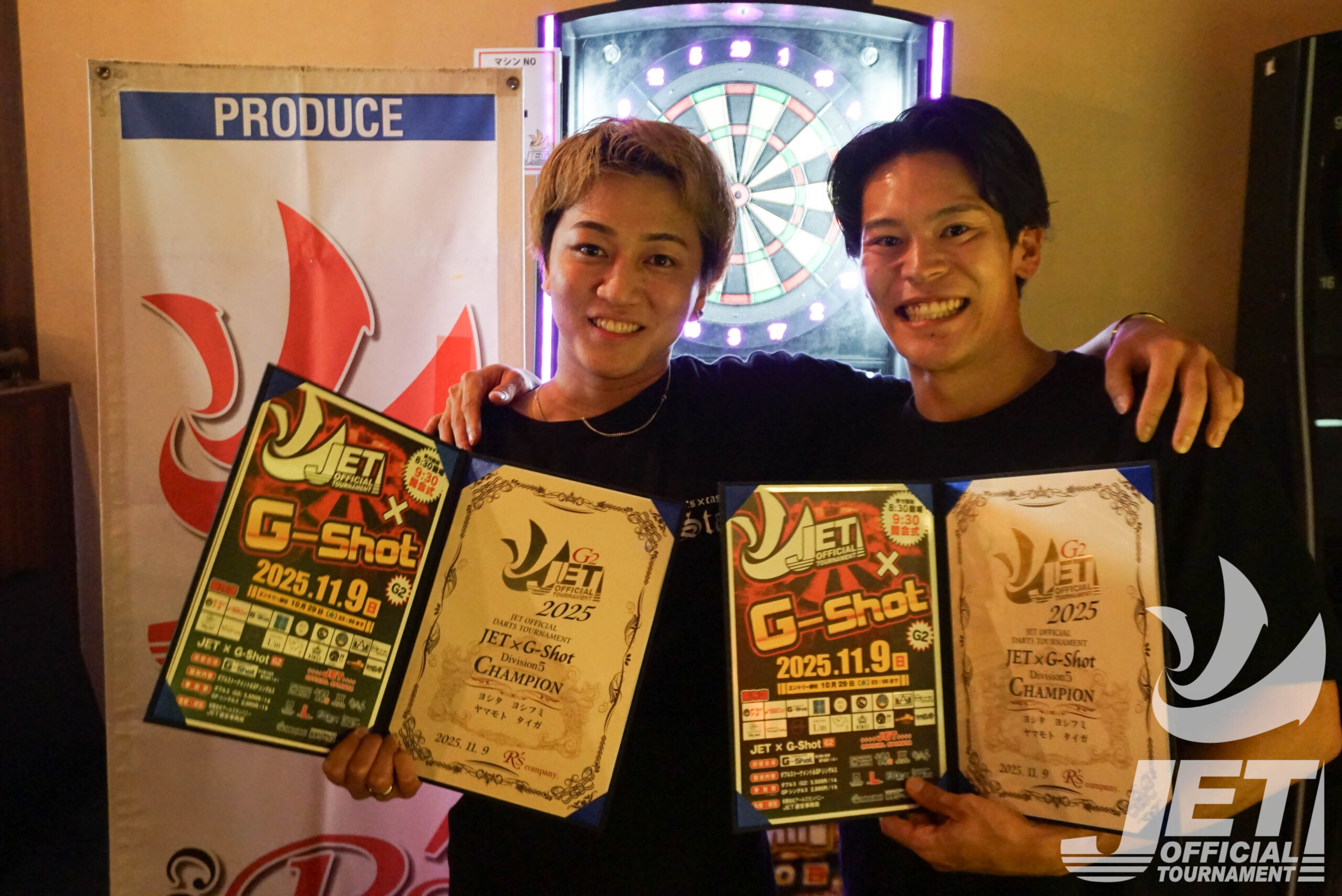 RESULTJET × G-Shot 男子GPシングル 優勝 ナカムラ ユウキ (80 pt) (FUN PLACES) 準優勝 シマザキ ユウスケ (64 pt) (Amuse&Drunk Hang out) 3位タイ ホンマ ユウト (51 pt) (FUN PLACES) 3位タイ タカハシ リョウ (51 pt) (ダーツショップ&Bar KINGS) 女子GPシングル 優勝 ナカムラ ユキコ (80 pt) (ダーツショップ&Bar KINGS) 準優勝 マツザワ リオ (64 pt) (BAR たらふく) 3位タイ ヒラタ ミキ (51 pt) (ruga) 3位タイ ムラセ サヤカ (51 pt) (FUN PLACES) DIVISION-1 優勝 イノ ショウキ ツキモリ カズヤ (16 pt) (Teru Cafe) 準優勝 ナカムラ ユウキ イトウ シュン (12 pt) (FUN PLACES) 3位タイ サイトウ カズヤ タガ カズヒロ (8 pt) (BAR たらふく) 3位タイ イナイ ヒロキ オガワ アキヒト (8 pt) (1/2 nibuichi) DIVISION-2 優勝 シマヤマ コウタロウ カワカミ マナブ (16 pt) (ダーツ&ビリヤード BAR バレット) 準優勝 ナエシロ ユウキ ナカガワ シホ (12 pt) (Darts Studio SPREAD) 3位タイ ババ コウイチ シラサキ サトシ (8 pt) (かじゅあるばぁ ぜろ。) 3位タイ シマザキ ユウスケ シマザキ サトカ (8 pt) (Amuse&Drunk Hang out) DIVISION-3 優勝 モリモト ヒロキ ナカジマ ユキ (16 pt) (かじゅあるばぁ ぜろ。) 準優勝 シマダ ユウイチロウ ホシナ セイジロウ (12 pt) (ダーツ&ビリヤード BAR バレット) 3位タイ タイラ ヤスヒト キタ マイコ (8 pt) (ダーツ&ビリヤード BAR バレット) 3位タイ スガハラ ヒロタカ タナカ ユウヤ (8 pt) (Boston Club) DIVISION-4 優勝 カスガ シンタロウ トビタ リナ (16 pt) (ruga) 準優勝 ハセガワ シンヤ イハラ タエコ (12 pt) (BAR たらふく) 3位タイ マスダ ショウスケ コバヤシ マサヤ (8 pt) (DARTS BAR Lim) 3位タイ フタギ カツキ アンドウ シュンヤ (8 pt) (DARTS&BAR Rodeo) DIVISION-5 優勝 ヨシタ ヨシフミ ヤマモト タイガ (16 pt) (darts×casualbar Stats) 準優勝 ウエキ ユウダイ ミヤザキ ショウタ (12 pt) (darts×casualbar Stats) 3位タイ オオヒラ ケイト アサクラ タイコウ (8 pt) (ダーツバー BULL) 3位タイ ホソイ ケン キハラ カヨコ (8 pt) (BAR たらふく) DIVISION-6 優勝 セキカワ アキラ セキカワ ユリコ (16 pt) (POOL&DARTSBAR G-Shot) 準優勝 マツイ ナナ アサダ ミレア (12 pt) (BAR たらふく) 3位タイ オノ アリア ミカワ ナツキ (8 pt) (POOL&DARTSBAR G-Shot) 3位タイ スエマサ リュウジ ムライ ケンタロウ (8 pt) (BAR たらふく) 2026 JET OFFICIAL SPONSORS Facebook JET DARTS Tournament Instagram JET2026 開幕戦! 2026年 2月 1日(日) 【 JET in 西川口 】G2 会場:LI 現在 2大会のエントリー受付開始しております JET2026 開幕戦! 2026年 2月 1日(日 JET2026 始動! ~エントリー方法が変わりました~ 本年度よりエントリーがスマートフォンより可 【 JET OFFICIAL DARTS TOURNAMENT 2025 】 お世話になっております JET2026 開幕戦! 2026年 2月 1日(日) 【 JET in 西川口 】G2 会場:LI 【 JET2025 全日程終了 】 ~ランキング確定しました~ 入賞された皆様、そして店舗様、 おめ JET2025 全日程終了 ~JETポイントランキング更新しました~ JET in 東京×hyper JET2025最終戦! 12月 14日(日) 【 JET in 東京×hyperelectra 】G JET2025最終戦! 12月 14日(日) 【 JET in 東京×hyperelectra 】G 公式Instagramをフォロー ホーム JETについて 大会規約 大会日程 大会結果 ランキング JETプレイヤー ギャラリー お問い合わせ
