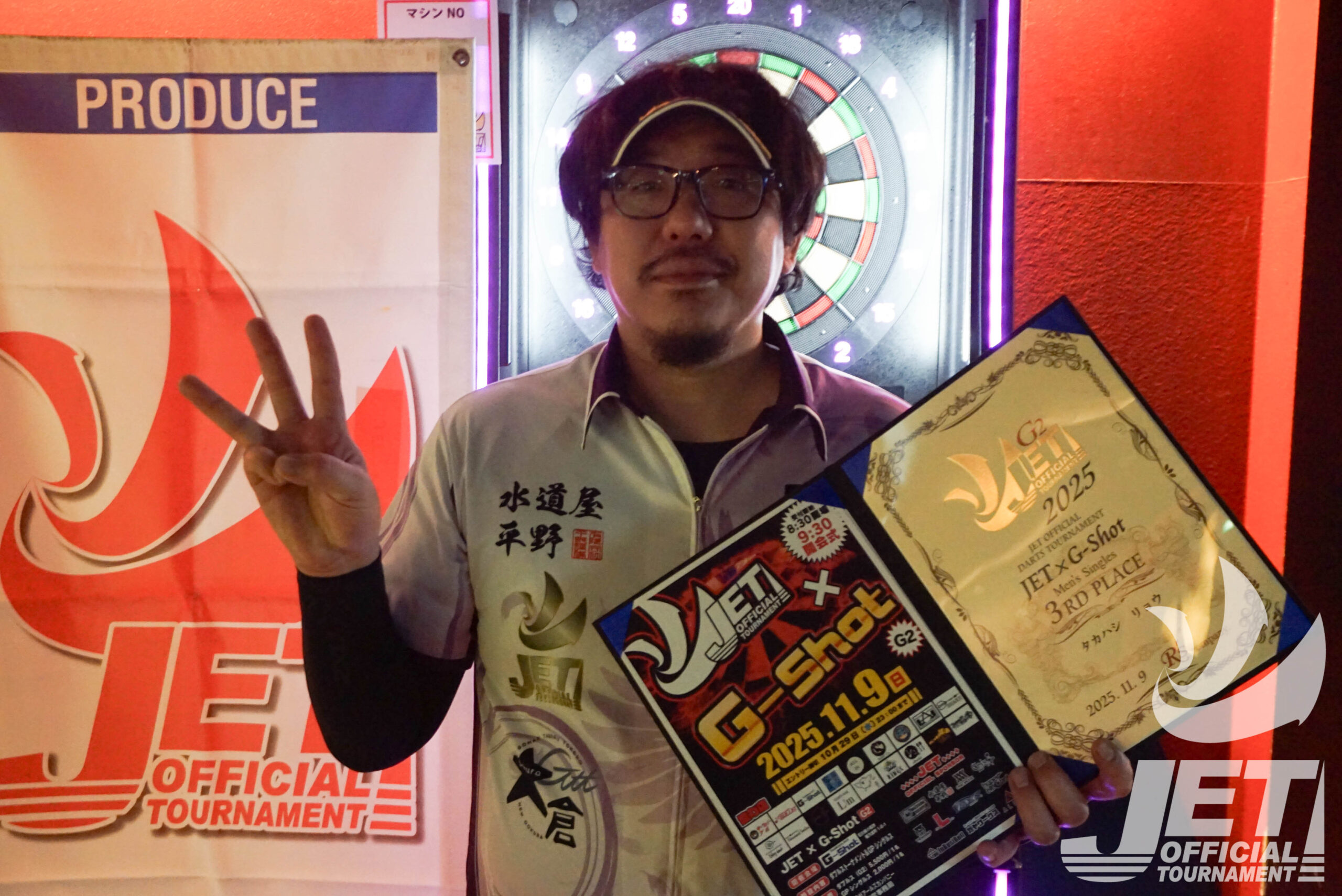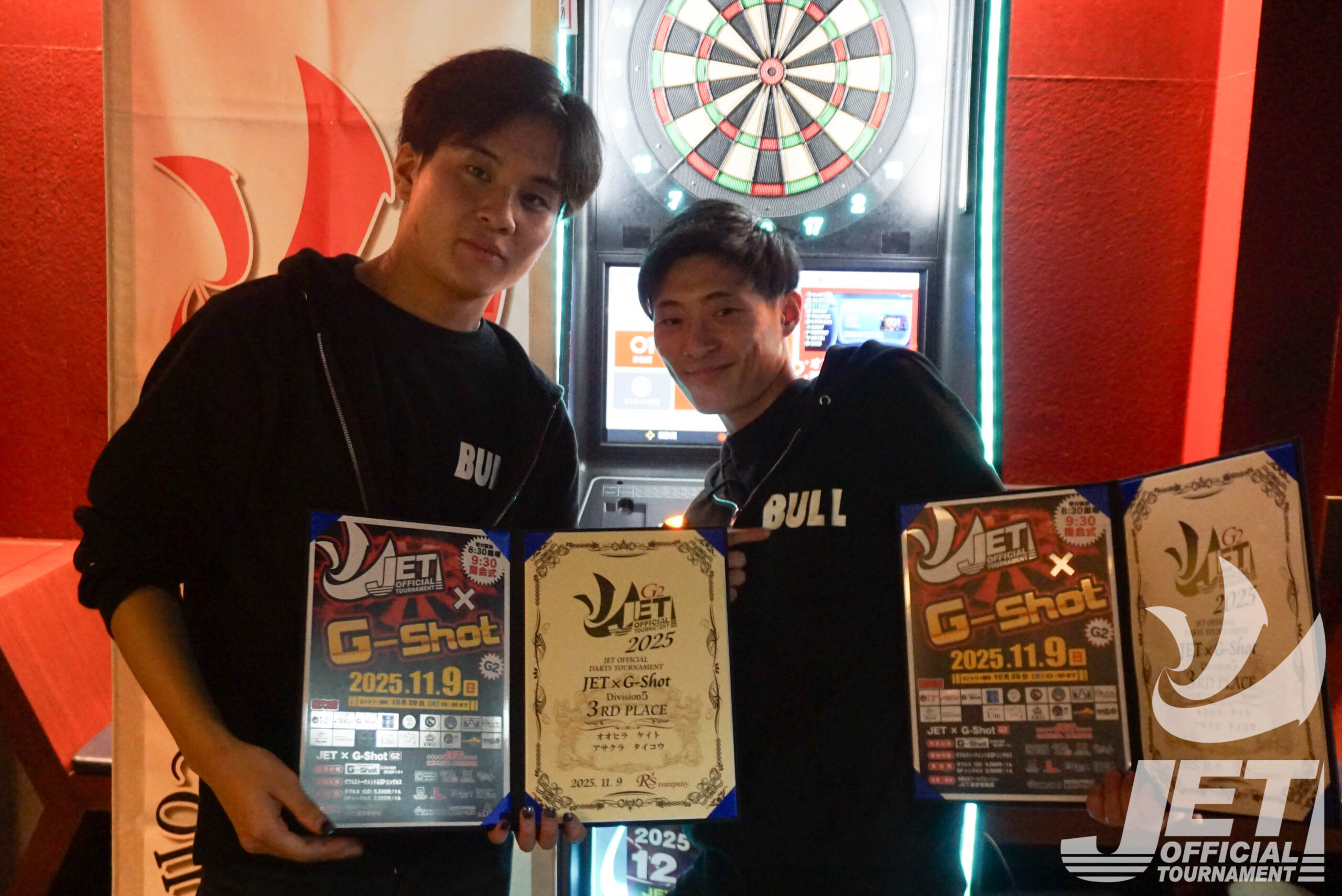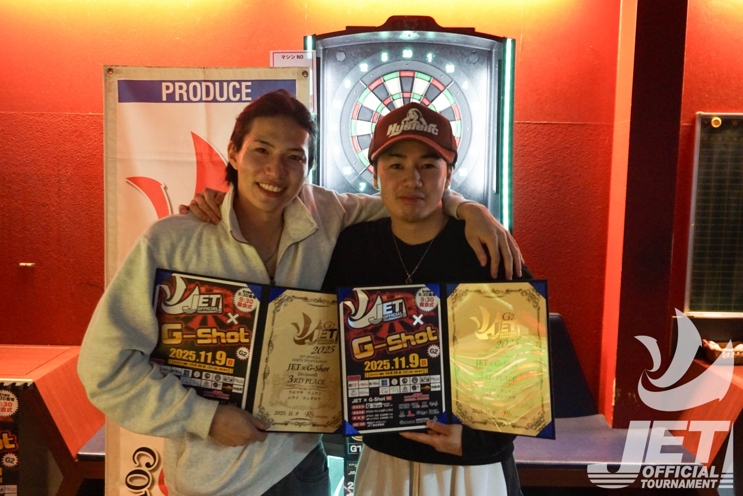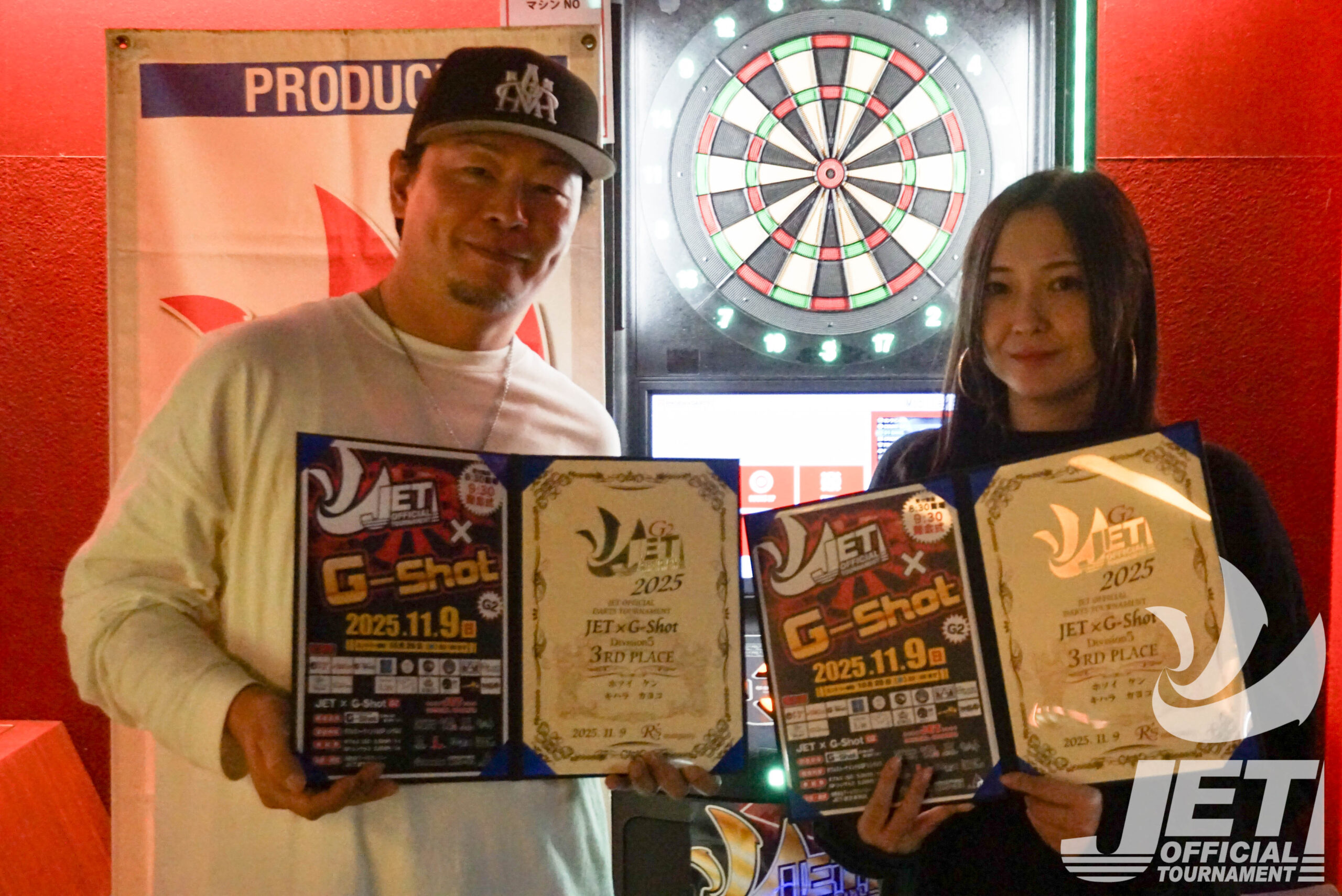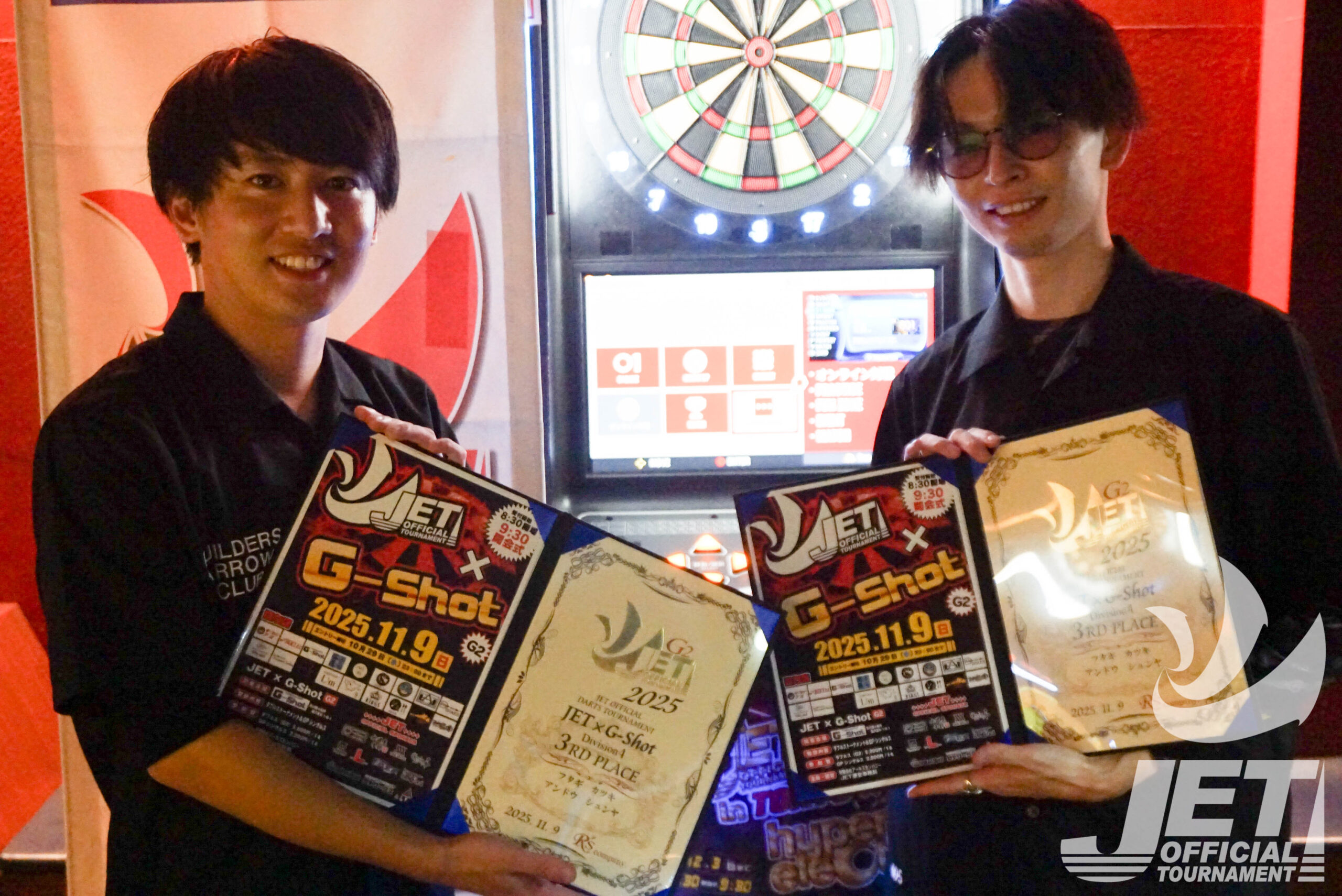 RESULTJET × G-Shot 男子GPシングル 優勝 ナカムラ ユウキ (80 pt) (FUN PLACES) 準優勝 シマザキ ユウスケ (64 pt) (Amuse&Drunk Hang out) 3位タイ ホンマ ユウト (51 pt) (FUN PLACES) 3位タイ タカハシ リョウ (51 pt) (ダーツショップ&Bar KINGS) 女子GPシングル 優勝 ナカムラ ユキコ (80 pt) (ダーツショップ&Bar KINGS) 準優勝 マツザワ リオ (64 pt) (BAR たらふく) 3位タイ ヒラタ ミキ (51 pt) (ruga) 3位タイ ムラセ サヤカ (51 pt) (FUN PLACES) DIVISION-1 優勝 イノ ショウキ ツキモリ カズヤ (16 pt) (Teru Cafe) 準優勝 ナカムラ ユウキ イトウ シュン (12 pt) (FUN PLACES) 3位タイ サイトウ カズヤ タガ カズヒロ (8 pt) (BAR たらふく) 3位タイ イナイ ヒロキ オガワ アキヒト (8 pt) (1/2 nibuichi) DIVISION-2 優勝 シマヤマ コウタロウ カワカミ マナブ (16 pt) (ダーツ&ビリヤード BAR バレット) 準優勝 ナエシロ ユウキ ナカガワ シホ (12 pt) (Darts Studio SPREAD) 3位タイ ババ コウイチ シラサキ サトシ (8 pt) (かじゅあるばぁ ぜろ。) 3位タイ シマザキ ユウスケ シマザキ サトカ (8 pt) (Amuse&Drunk Hang out) DIVISION-3 優勝 モリモト ヒロキ ナカジマ ユキ (16 pt) (かじゅあるばぁ ぜろ。) 準優勝 シマダ ユウイチロウ ホシナ セイジロウ (12 pt) (ダーツ&ビリヤード BAR バレット) 3位タイ タイラ ヤスヒト キタ マイコ (8 pt) (ダーツ&ビリヤード BAR バレット) 3位タイ スガハラ ヒロタカ タナカ ユウヤ (8 pt) (Boston Club) DIVISION-4 優勝 カスガ シンタロウ トビタ リナ (16 pt) (ruga) 準優勝 ハセガワ シンヤ イハラ タエコ (12 pt) (BAR たらふく) 3位タイ マスダ ショウスケ コバヤシ マサヤ (8 pt) (DARTS BAR Lim) 3位タイ フタギ カツキ アンドウ シュンヤ (8 pt) (DARTS&BAR Rodeo) DIVISION-5 優勝 ヨシタ ヨシフミ ヤマモト タイガ (16 pt) (darts×casualbar Stats) 準優勝 ウエキ ユウダイ ミヤザキ ショウタ (12 pt) (darts×casualbar Stats) 3位タイ オオヒラ ケイト アサクラ タイコウ (8 pt) (ダーツバー BULL) 3位タイ ホソイ ケン キハラ カヨコ (8 pt) (BAR たらふく) DIVISION-6 優勝 セキカワ アキラ セキカワ ユリコ (16 pt) (POOL&DARTSBAR G-Shot) 準優勝 マツイ ナナ アサダ ミレア (12 pt) (BAR たらふく) 3位タイ オノ アリア ミカワ ナツキ (8 pt) (POOL&DARTSBAR G-Shot) 3位タイ スエマサ リュウジ ムライ ケンタロウ (8 pt) (BAR たらふく) 2026 JET OFFICIAL SPONSORS Facebook JET DARTS Tournament Instagram JET2026 開幕戦! 2026年 2月 1日(日) 【 JET in 西川口 】G2 会場:LI 現在 2大会のエントリー受付開始しております JET2026 開幕戦! 2026年 2月 1日(日 JET2026 始動! ~エントリー方法が変わりました~ 本年度よりエントリーがスマートフォンより可 【 JET OFFICIAL DARTS TOURNAMENT 2025 】 お世話になっております JET2026 開幕戦! 2026年 2月 1日(日) 【 JET in 西川口 】G2 会場:LI 【 JET2025 全日程終了 】 ~ランキング確定しました~ 入賞された皆様、そして店舗様、 おめ JET2025 全日程終了 ~JETポイントランキング更新しました~ JET in 東京×hyper JET2025最終戦! 12月 14日(日) 【 JET in 東京×hyperelectra 】G JET2025最終戦! 12月 14日(日) 【 JET in 東京×hyperelectra 】G 公式Instagramをフォロー ホーム JETについて 大会規約 大会日程 大会結果 ランキング JETプレイヤー ギャラリー お問い合わせ