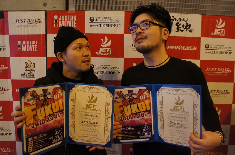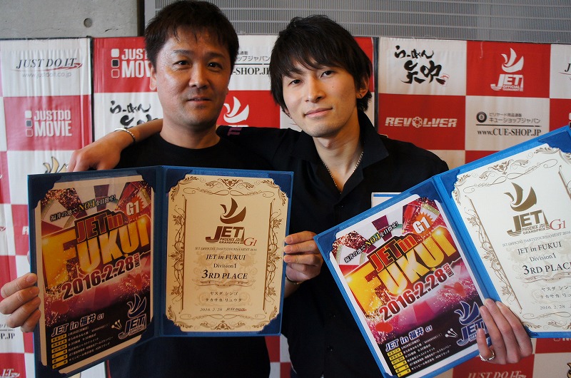 | 優勝 ヤマモト ユウ タナカ ユウキ (Seven R - 12 pt) | 準優勝 ハヤシ リュウ サカシタ フミヒロ (POWER SPOT FUKUI - 8 pt) | 3位 ヒライ タカナオ ナカダ トモナオ (ダーツバーBULL - 4 pt) | 3位 オオタ タカヤ ハマノ マサシ (NICE 70’S - 4 pt) |