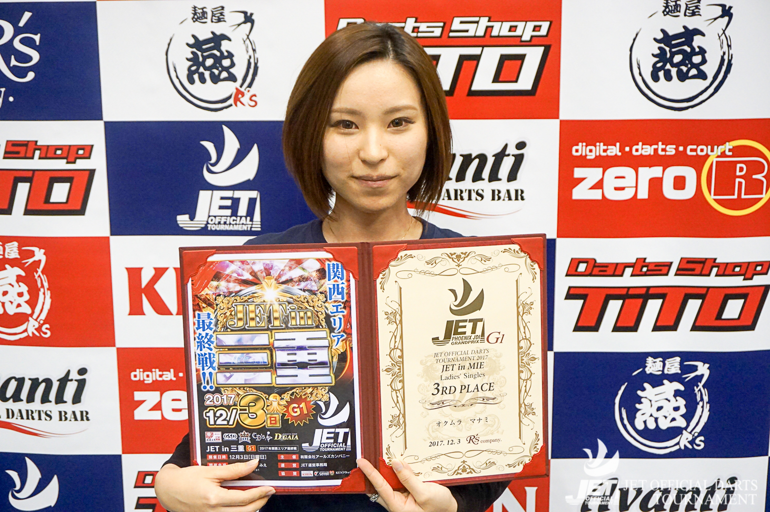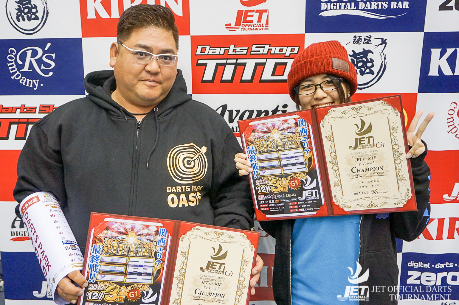 | 優勝 ワキ ヒデカズ オザキ チグサ (DARTS PARK OASIS – 14 pt) |
